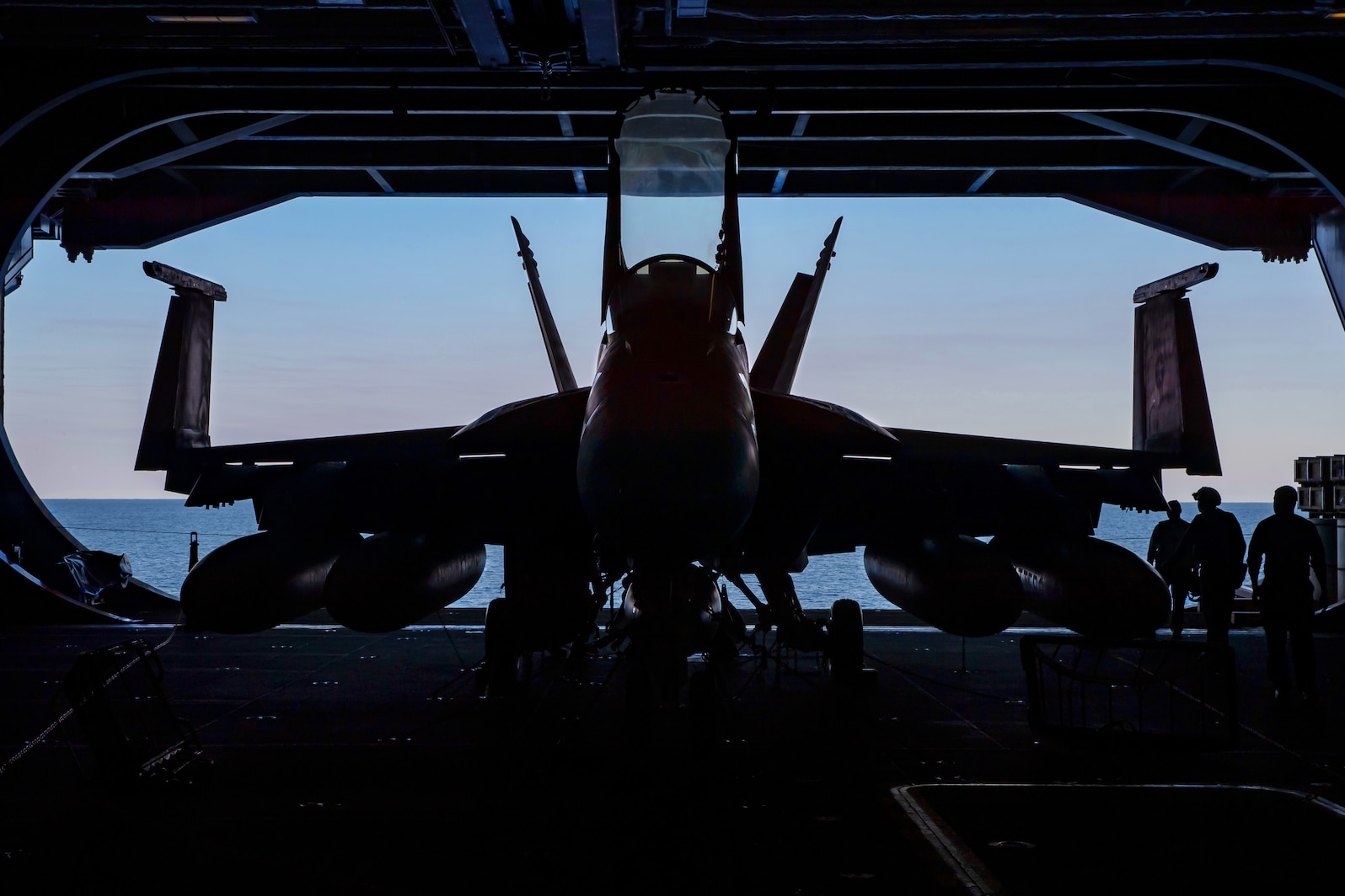 ATLANTIC OCEAN (Oct. 7, 2022) An F/A-18E Super Hornet attached to the "Tomcatters" of Strike Fighter Squadron (VFA) 31 is staged in the hangar bay of the first-in-class aircraft carrier USS Gerald R. Ford (CVN 78), Oct. 7, 2022. The Gerald R. Ford Carrier Strike Group (GRFCSG) is deployed in the Atlantic Ocean, conducting training and operations alongside NATO Allies and partners to enhance integration for future operations and demonstrate the U.S. Navy's commitment to a peaceful, stable and conflict-free Atlantic region. (U.S. Navy photo by Mass Communication Specialist 2nd Class Nolan Pennington)
