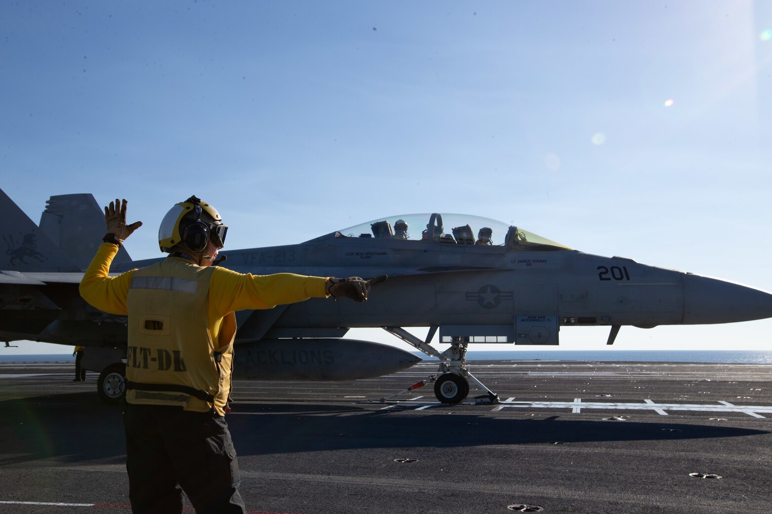 ATLANTIC OCEAN (Oct. 7, 2022) Aviation Boatswain's Mate (Handling) 3rd Class Shelby Bilodeau, from Arlington, Texas, assigned to the first-in-class aircraft carrier USS Gerald R. Ford's (CVN 78) air department, prepares an F/A-18F Super Hornet, attached to the "Blacklions" of Strike Fighter Squadron (VFA) 213, to launch from the flight deck, Oct. 7, 2022. The Gerald R. Ford Carrier Strike Group (GRFCSG) is deployed in the Atlantic Ocean, conducting training and operations alongside NATO Allies and partners to enhance integration for future operations and demonstrate the U.S. Navy's commitment to a peaceful, stable and conflict-free Atlantic region. (U.S. Navy photo by Mass Communication Specialist 2nd Class Zack Guth)
