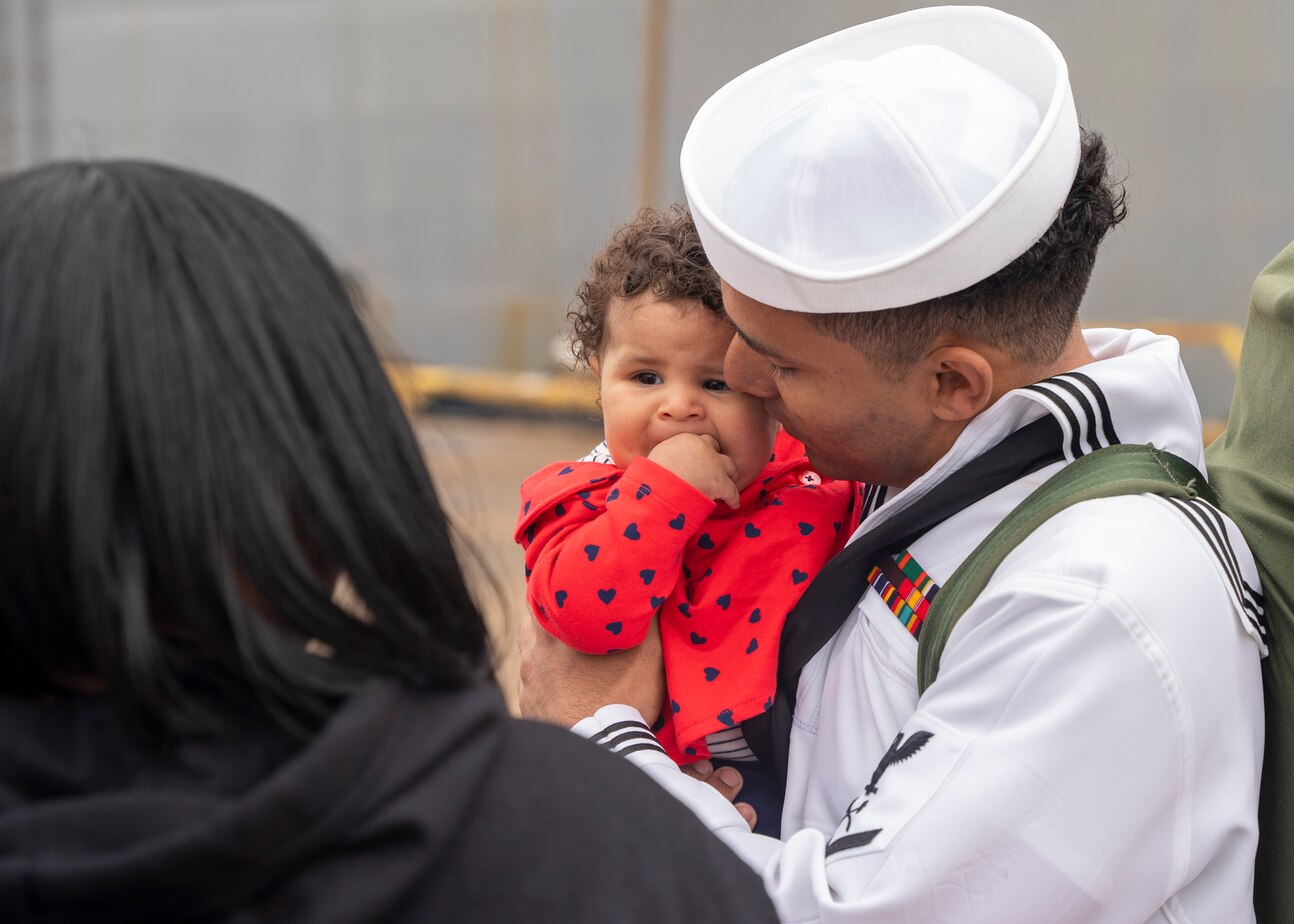 VIRGINIA BEACH, Va. (Oct. 13, 2022) – Sailors assigned to the Whidbey Island-class dock landing ship USS Gunston Hall (LSD 44) reunite with their families on the pier after the ship returned to Joint Expeditionary Base Little Creek-Fort Story following a deployment with the Kearsarge Amphibious Ready Group (ARG), Oct. 13. More than 4,000 Sailors and Marines assigned to the Kearsarge ARG supported a wide range of interoperability opportunities and exercises across the U.S. Sixth Fleet area of operations increasing combat readiness and crisis response capabilities while strengthening relationships with both NATO Allies and partners. (U.S. Navy photo by Mass Communication Specialist 1st Class Kris R. Lindstrom)