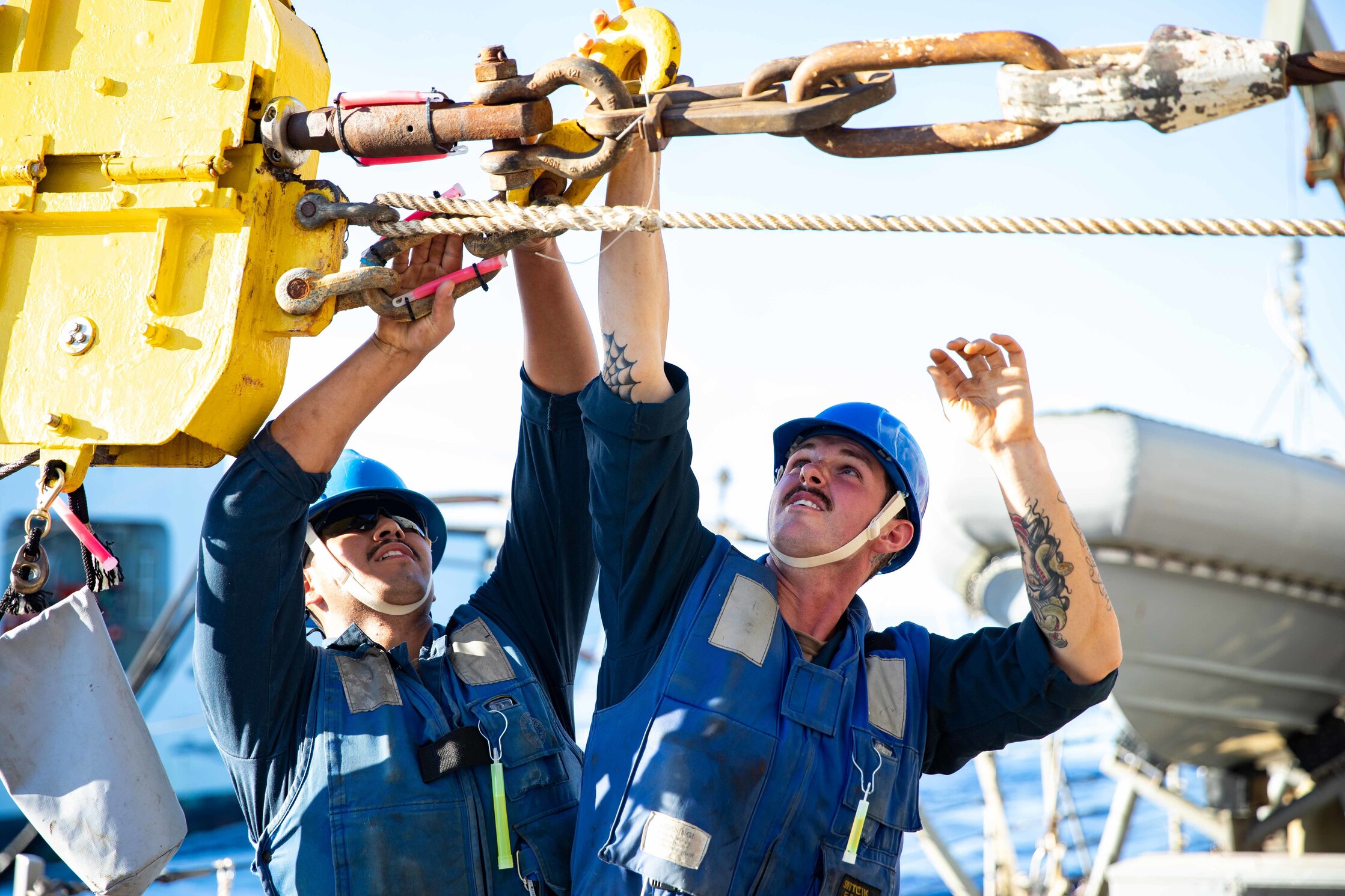 ATLANTIC OCEAN (Oct. 16, 2022) Seaman Alexis Contreras Vazquez, left, and Boatswain's Mate Seaman John Ryan, both assigned to the Arleigh Burke-class guided-missile destroyer USS Ramage (DDG 61), prepare the cargo rig to receive supplies during a replenishment-at-sea with the Royal Canadian Navy supply ship MV Asterix as part of the Gerald R. Ford Carrier Strike Group, Oct. 17, 2022. The first-in-class aircraft carrier USS Gerald R. Ford (CVN 78) is on its inaugural deployment conducting training and operations alongside NATO Allies and partners to enhance integration for future operations and demonstrate the U.S. Navy's commitment to a peaceful, stable and conflict free Atlantic region. (U.S. Navy photo by Mass Communication Specialist 2nd Class Sawyer Connally)