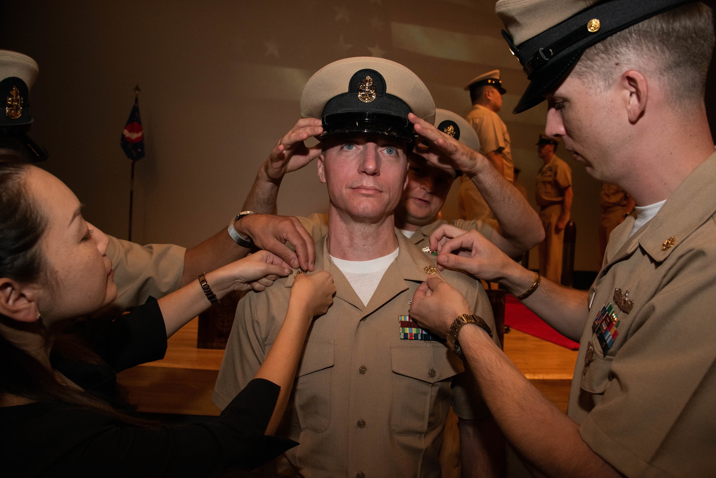 YOKOSUKA, Japan (Oct. 21, 2022) Chief Fire Controlman (Aegis) David Necaise, attached to Commander, Fleet Activities Yokosuka (CFAY), is pinned and receives his combination cover during a chief petty officer pinning ceremony hosted at the Fleet Theater onboard Commander, Fleet Activities Yokosuka (CFAY). Eighteen Sailors from CFAY and tenant commands were promoted to the rank of chief petty officer during the ceremony. For more than 75 years, CFAY has provided, maintained, and operated base facilities and services in support of the U.S. 7th Fleet's forward-deployed naval forces, tenant commands, and thousands of military and civilian personnel and their families. (U.S. Navy photo by Ryo Isobe)