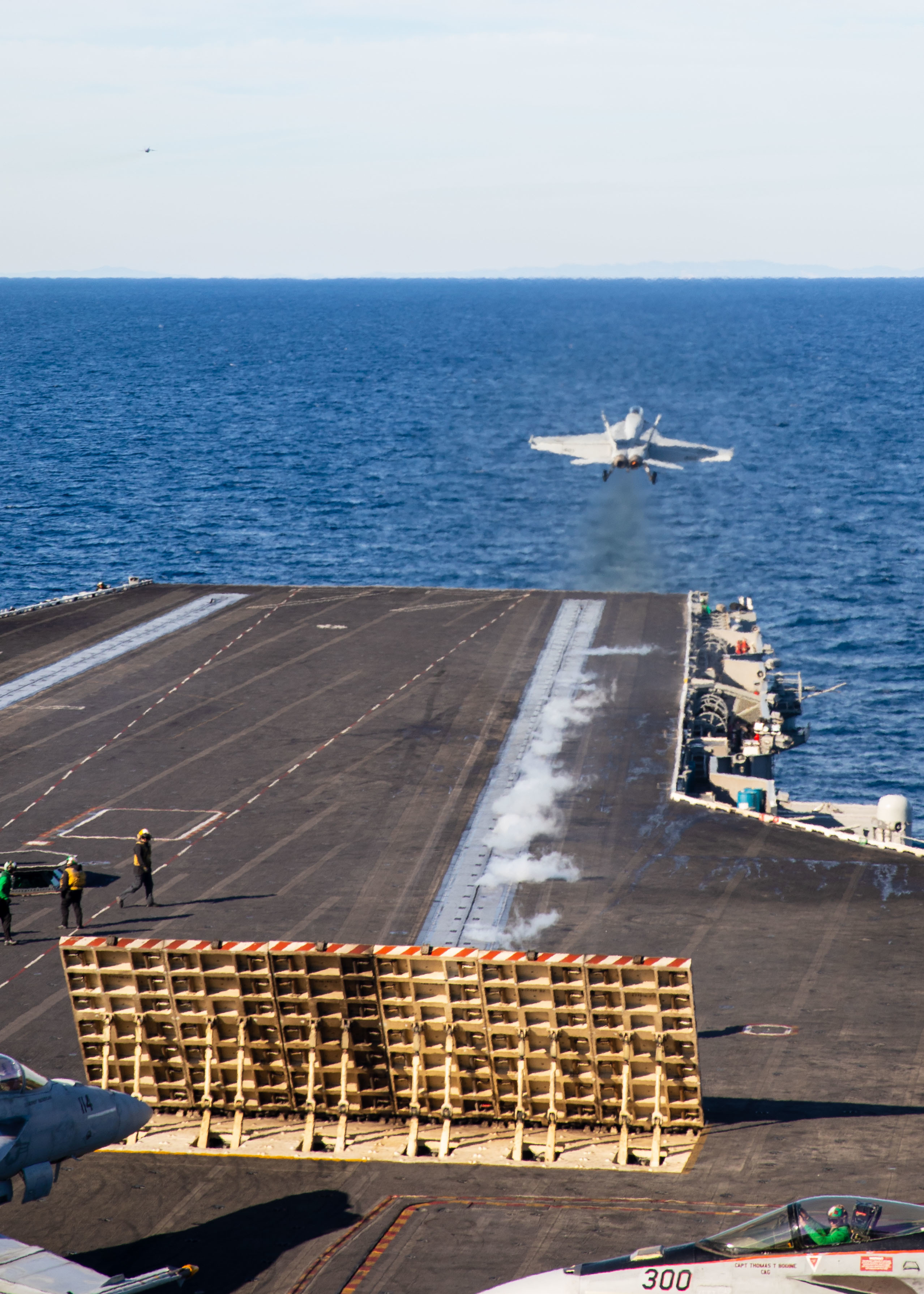 ADRIATIC SEA (Nov. 11, 2022) An F/A18E Super Hornet aircraft, attached to Strike Fighter Squadron (VFA) 136, takes off from the flight deck of the Nimitz-class aircraft carrier USS George H.W. Bush (CVN 77), Nov. 11, 2022. Carrier Air Wing (CVW) 7 is the offensive air and strike component of Carrier Strike Group (CSG) 10, George H.W. Bush Carrier CSG. The squadrons of CVW-7 are VFA-86, VFA-103, VFA-136, VFA-143, Carrier Airborne Early Warning Squadron (VAW) 121, Electronic Attack Squadron (VAQ) 140, Helicopter Sea Combat Squadron (HSC) 5, and Helicopter Maritime Strike Squadron (HSM) 46. The George H.W. Bush CSG is on a scheduled deployment in the U.S. Naval Forces Europe area of operations, employed by U.S. Sixth Fleet to defend U.S., allied, and partner interests. (U.S. Navy photo by Mass Communication Specialist Seaman Curtis Burdick)