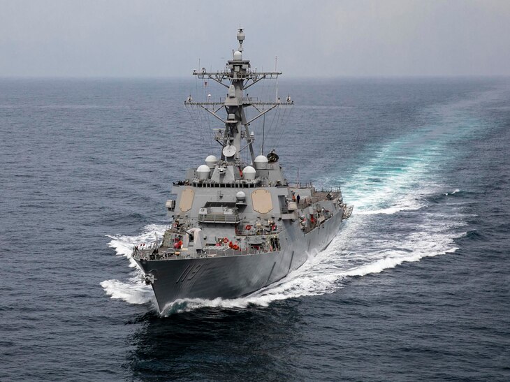 ARABIAN GULF (Nov. 11, 2022) A U.S. Air Force AC-130J Ghostrider and a Navy P-8A Poseidon fly over guided-missile destroyer USS Delbert D. Black (DDG 119) while operating in the Arabian Gulf. Delbert D. Black is deployed to the U.S. 5th Fleet area of operations to help ensure maritime security and stability in the Middle East region. (U.S. Navy photo by Mass Communication Specialist 3rd Class Jeremy R. Boan)
