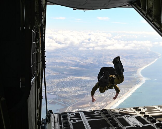 SAN DIEGO (Nov. 2, 2022) A West Coast-based Naval Special Warfare operator parachutes out of a C-130J Super Hercules aircraft during a training evolution. Naval Special Warfare is the nation’s premier maritime special operations force, uniquely positioned to extend the fleet’s reach and deliver all domain options for naval and joint force commands. (U.S. Navy photo by Mass Communication Specialist 1st Class Chelsea D. Meiller)