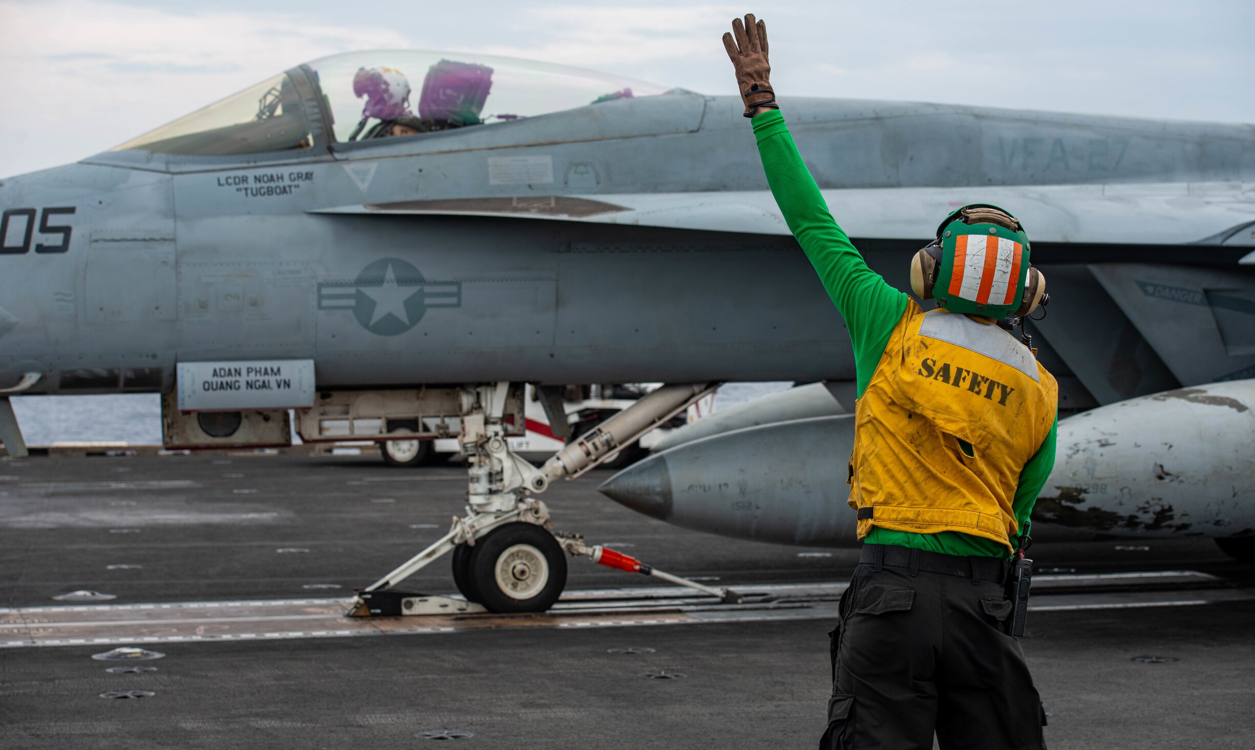 PHILIPPINE SEA (Nov. 15, 2022) Aviation Boatswain’s Mate (Equipment) 2nd Class Zackary Wilkinson, from Denham Springs, Louisiana, signals to an F/A-18E Super Hornet, attached to the Royal Maces of Strike Fighter Squadron (VFA) 27, to increase power prior to launch from the flight deck of the U.S. Navy’s only forward-deployed aircraft carrier, USS Ronald Reagan (CVN 76), in the Philippine Sea. The Royal Maces conduct carrier-based air strikes and strike force escort missions, as well as ship, battle group, and intelligence collection operations. Ronald Reagan, the flagship of Carrier Strike Group 5, provides a combat-ready force that protects and defends the United States, and supports alliances, partnerships and collective maritime interests in the Indo-Pacific region. (U.S. Navy photo by Mass Communication Specialist 2nd Class Michael B. Jarmiolowski)