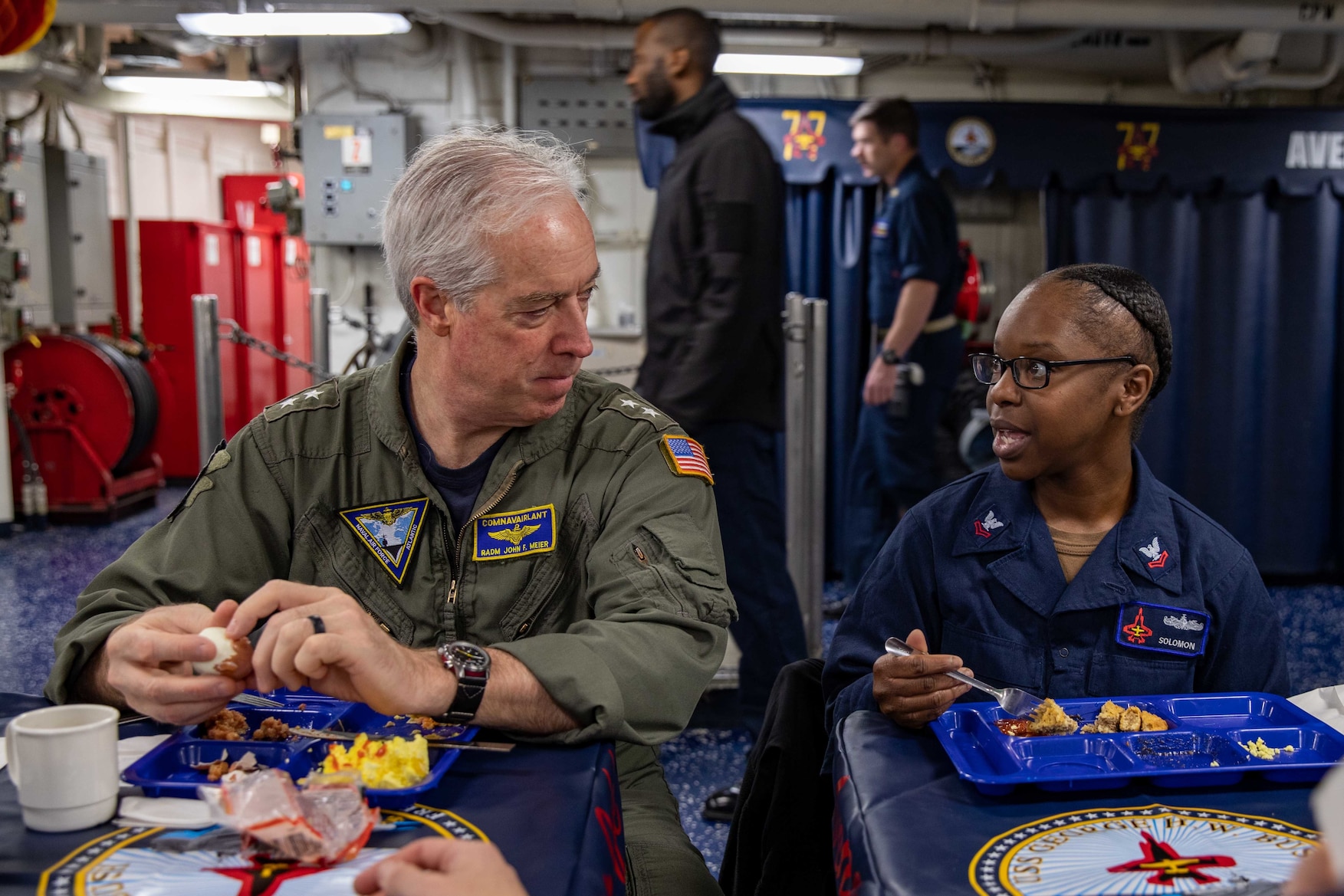 ADRIATIC SEA (Nov. 14, 2022) Rear Adm. John Meier, commander of Naval Air Force Atlantic, talks with Quartermaster 2nd Class Brittney Solomon aboard the Nimitz-class aircraft carrier USS George H. W. Bush (CVN 77) during breakfast with the crew, Nov. 14, 2022. The George H.W. Bush Carrier Strike Group is on a scheduled deployment in the U.S. Naval Forces Europe area of operations, employed by U.S. Sixth Fleet to defend U.S., allied and partner interests. (U.S. Navy photo by Mass Communication Specialist Seaman Chandler Ludke)