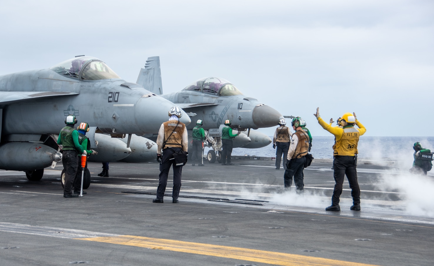PHILIPPPINE SEA (Nov. 25, 2022) Sailors prepare an F/A-18E Super Hornet, attached to the Royal Maces of Strike Fighter Squadron (VFA) 27, and an F/A-18F Super Hornet, attached to the Diamondbacks of Strike Fighter Squadron (VFA) 102, for launch on the flight deck of the U.S. Navy’s only forward-deployed aircraft carrier, USS Ronald Reagan (CVN 76), in the Philippine Sea. Ronald Reagan, the flagship of Carrier Strike Group 5, provides a combat-ready force that protects and defends the United States, and supports Alliances, partnerships and collective maritime interests in the Indo-Pacific region. (U.S. Navy photo by Mass Communication Specialist 3rd Class Oswald Felix Jr.)