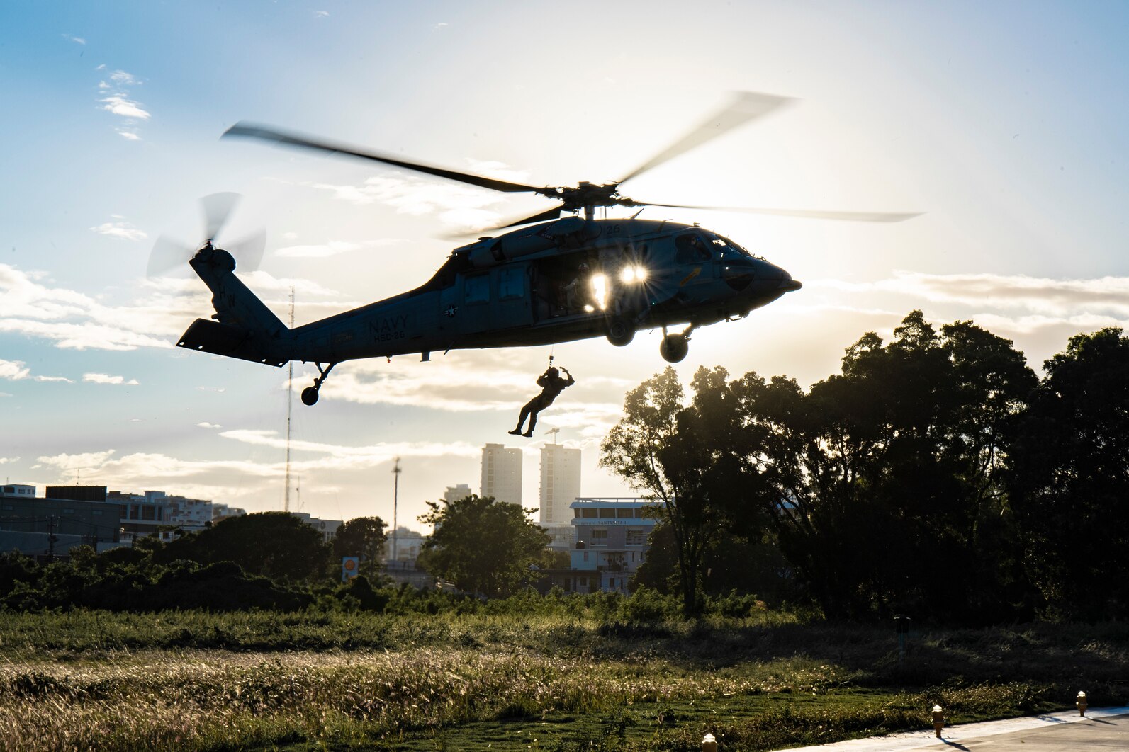 SANTO DOMINGO, Dominican Republic (Dec. 1, 2022) An MH60-S Seahawk, attached to the “Chargers” of Helicopter Sea Combat Squadron (HSC) 26, hoists Naval Air Crewman (helicopter) 3rd Class Thomas Haynes, from Miami, during a Continuing Promise humanitarian assistance and disaster relief exercise, Dec. 1, 2022. Continuing Promise 2022 is a humanitarian assistance and goodwill mission conducting direct medical care, expeditionary veterinary care, and subject matter expert exchanges with five partner nations in the Caribbean, Central and South America. (U.S. Navy photo by Mass Communication Specialist 1st Class James Mullen)