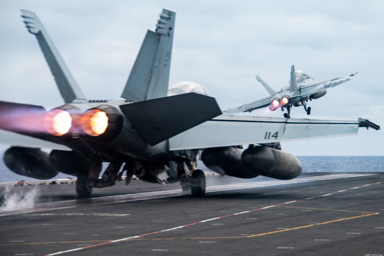 PHILIPPINE SEA (Dec. 2, 2022) Two F/A-18F Super Hornets, attached to the Diamondbacks of Strike Fighter Squadron (VFA) 102, launch from the flight deck of the U.S. Navy’s only forward-deployed aircraft carrier USS Ronald Reagan (CVN 76) in the Philippine Sea, Dec. 2, 2022. The Diamondbacks conduct carrier-based air strikes and strike force escort missions, as well as ship, battle group, and intelligence collection operations. Ronald Reagan, the flagship of Carrier Strike Group 5, provides a combat-ready force that protects and defends the United States, and supports Alliances, partnerships and collective maritime interests in the Indo-Pacific region. (U.S. Navy photo by Mass Communication Specialist 3rd Class Oswald Felix Jr.)