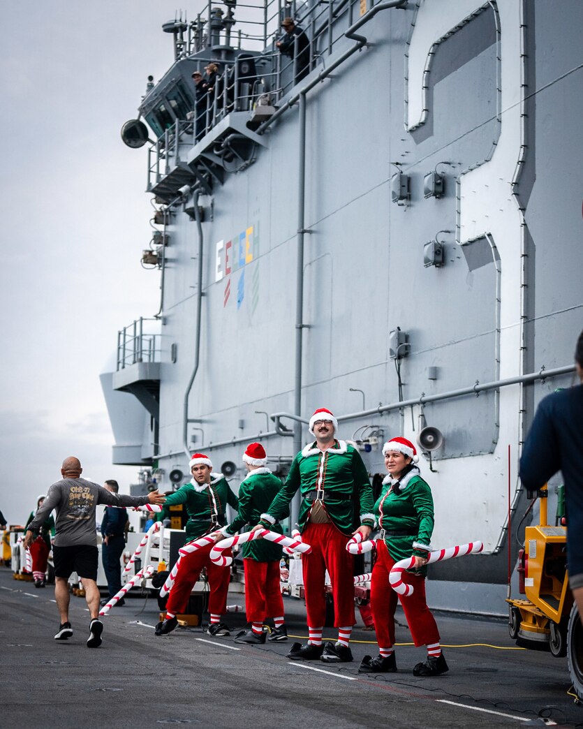 ATLANTIC OCEAN (Dec. 3, 2022) Sailors participate in a holiday themed 5k run on the flight deck of the Wasp-class amphibious assault ship USS Kearsarge (LHD 3) Dec. 3, 2022. Kearsarge is underway in the Atlantic Ocean conducting LCAC 100 tests and qualifications. (U.S. Navy photo by Mass Communication Specialist 2nd Class Taylor Parker)