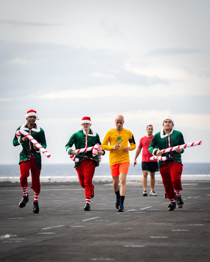 ATLANTIC OCEAN (Dec. 3, 2022) Sailors participate in a holiday themed 5k run on the flight deck of the Wasp-class amphibious assault ship USS Kearsarge (LHD 3) Dec. 3, 2022. Kearsarge is underway in the Atlantic Ocean conducting LCAC 100 tests and qualifications. (U.S. Navy photo by Mass Communication Specialist 2nd Class Taylor Parker)