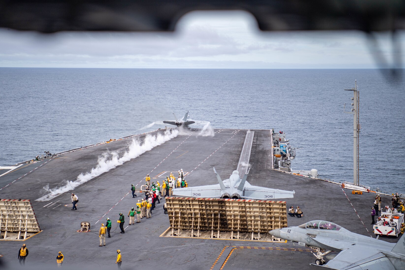 PACIFIC OCEAN (Dec. 3, 2022) An F/A-18E Super Hornet, from the “Kestrels” of Strike Fighter Squadron (VFA) 137, launches off the flight deck of the aircraft carrier USS Nimitz (CVN 68). Nimitz is underway conducting routine operations. (U.S. Navy photo by Mass Communication Specialist 3rd Class Kenneth Lagadi)