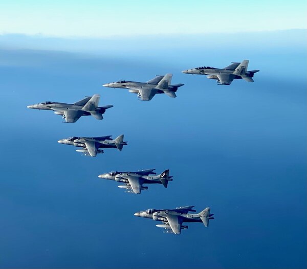 IONIAN SEA (Nov. 23, 2022) F/A-18 Super Hornets from Carrier Air Wing (CVW) 7 fly in formation with Italian Navy AV-8B Harrier aircraft over the Ionia Sea, Nov. 23, 2022. Carrier Air Wing (CVW) 7 is the offensive air and strike component of Carrier Strike Group (CSG) 10 and the George H.W. Bush CSG. The squadrons of CVW-7 are Strike Fighter Squadron (VFA) 143, VFA-103, VFA-86, VFA-136, Electronic Attack Squadron (VAQ) 140, Carrier Airborne Early Warning Squadron (VAW) 121, Helicopter Sea Combat Squadron (HSC) 5, and Helicopter Maritime Strike Squadron (HSM) 46. The George H.W. Bush CSG is on a scheduled deployment in the U.S. Naval Forces Europe area of operations, employed by U.S. 6th Fleet to defend U.S., allied, and partner interests. (U.S. Navy courtesy photos)