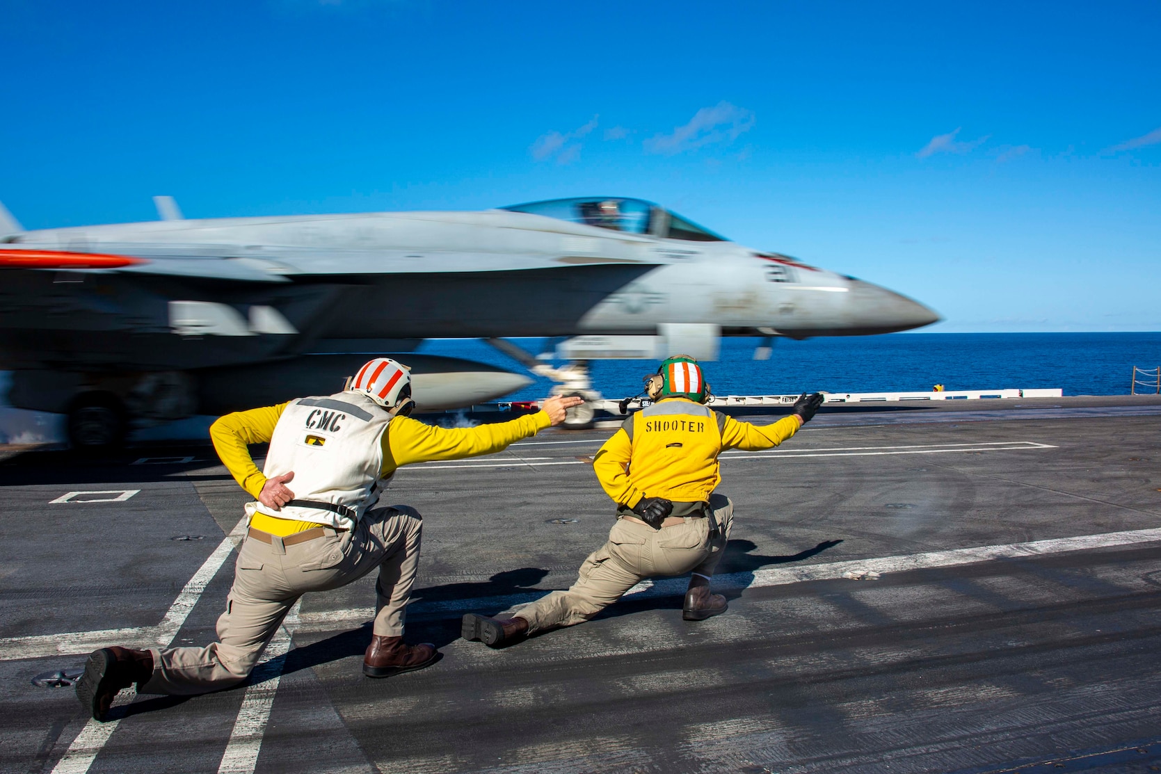 PACIFIC OCEAN (Dec. 7, 2022) Command Master Chief Joel Rodriguez, left, from Woodland, Calif., and Lt. Cmdr. Andrew Castro, from Knoxville, Tenn., signal a F/A-18E Super Hornet assigned to Strike Fighter Squadron (VFA) 14 to launch from the flight deck of the Nimitz-class aircraft carrier USS Abraham Lincoln (CVN 72). Abraham Lincoln is underway conducting routine operations in U.S. 3rd Fleet. (U.S. Navy photo by Mass Communication Specialist 3rd Class Han Puyu)