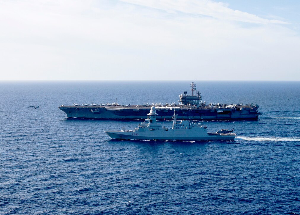 TYRRHENIAN SEA (Dec. 6, 2022) The Nimitz-class aircraft carrier USS George H.W. Bush (CVN 77) transits the Tyrrhenian Sea with the Italian navy Carlo Bergamini-class frigate ITS Carabiniere (F 593) as an F/A-18 Super Hornet from Carrier Air Wing (CVW) 7 takes off during combined operations, Dec. 6, 2022. The George H.W. Bush Carrier Strike Group is on a scheduled deployment in the U.S. Naval Forces Europe area of operations, employed by U.S. 6th Fleet to defend U.S., allied, and partner interests. (U.S. Navy photo by Mass Communication Specialist 2nd Class Stuart Posada)