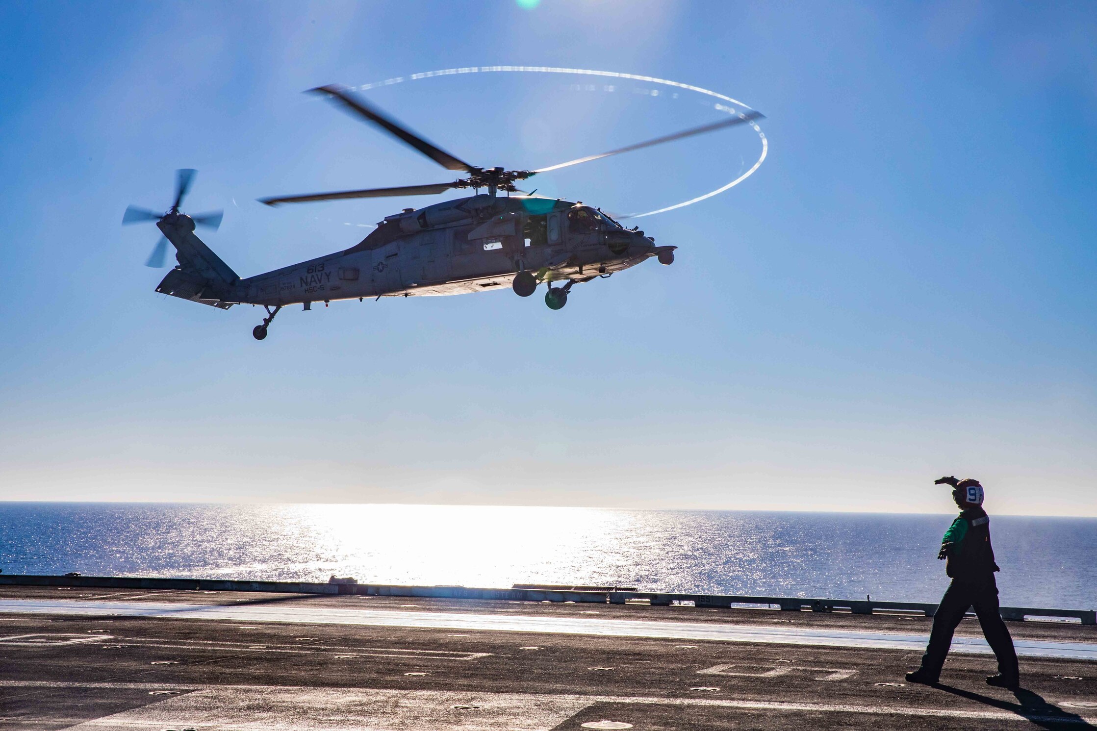 ADRIATIC SEA (Dec. 26, 2022) Airman Estafany Rodriguez directs the landing of an MH-60S Nighthawk helicopter attached to Helicopter Sea Combat Squadron (HSC) 5 aboard the Nimitz-class aircraft carrier USS George H. W. Bush (CVN 77), Dec. 26, 2022. Carrier Air Wing (CVW) 7 is the offensive air and strike component of Carrier Strike Group 10, George H.W. Bush Carrier Strike Group (GHWBCSG). The squadrons of CVW-7 are Strike Fighter Squadron (VFA) 86, VFA-103, VFA-136, VFA-143, Electronic Attack Squadron (VAQ) 140, Carrier Airborne Early Warning Squadron (VAW) 121, HSC-5, and Helicopter Maritime Strike Squadron (HSM) 46. The GHWBCSG is on a scheduled deployment in the U.S. Naval Forces Europe area of operations, employed by U.S. Sixth Fleet to defend U.S., allied and partner interests. (U.S. Navy photo by Mass Communication Specialist Seaman Sasha Ambrose)