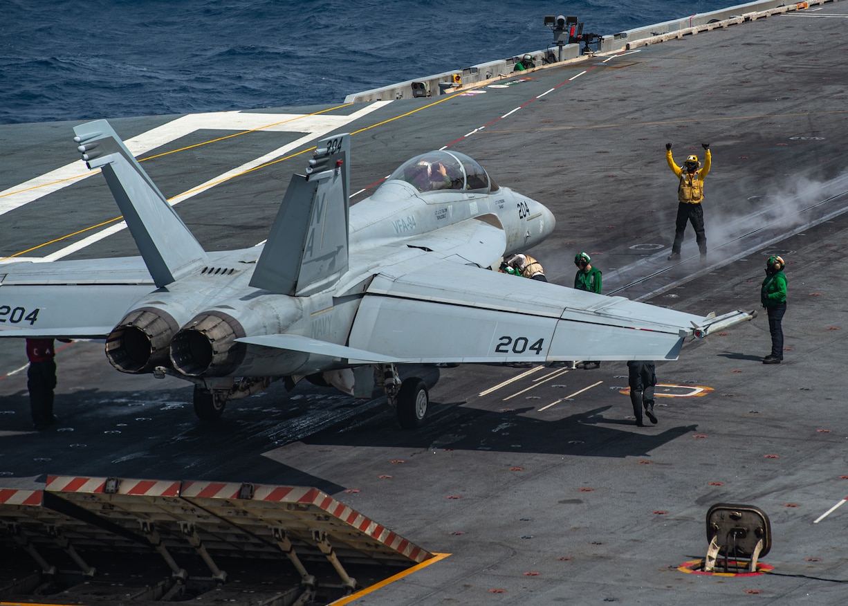 SOUTH CHINA SEA (Jan. 18, 2023) An F/A-18F Super Hornet from the “Mighty Shrikes” of Strike Fighter Squadron (VFA) 94 lines up on a catapult on the flight deck of the aircraft carrier USS Nimitz (CVN 68). Nimitz is in U.S. 7th Fleet conducting routine operations. U.S. 7th Fleet is the U.S. Navy's largest forward-deployed numbered fleet, and routinely interacts and operates with Allies and partners in preserving a free and open Indo-Pacific region. (U.S. Navy photo by Mass Communication Specialist 3rd Class Joseph Calabrese)