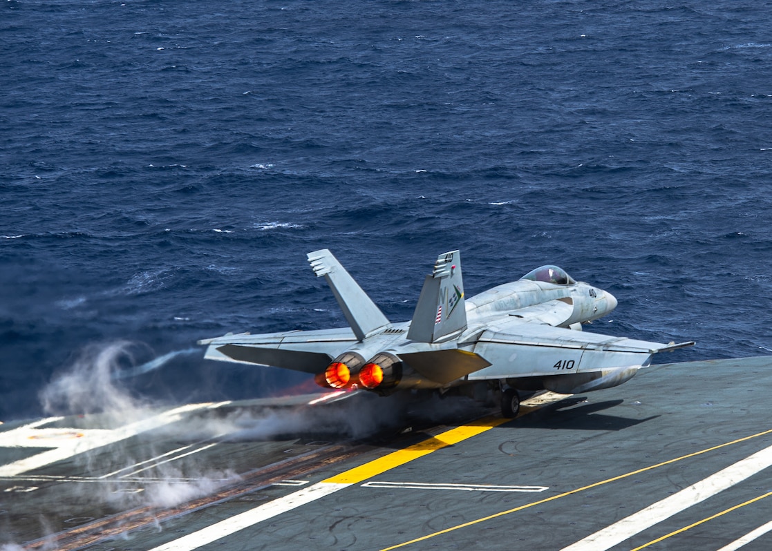 SOUTH CHINA SEA (Jan. 18, 2023) An F/A-18E Super Hornet from the “Blue Diamonds” of Strike Fighter Squadron (VFA) 146 launches from the flight deck of the aircraft carrier USS Nimitz (CVN 68). Nimitz is in U.S. 7th Fleet conducting routine operations. U.S. 7th Fleet is the U.S. Navy's largest forward-deployed numbered fleet, and routinely interacts and operates with Allies and partners in preserving a free and open Indo-Pacific region. (U.S. Navy photo by Mass Communication Specialist 3rd Class Joseph Calabrese)