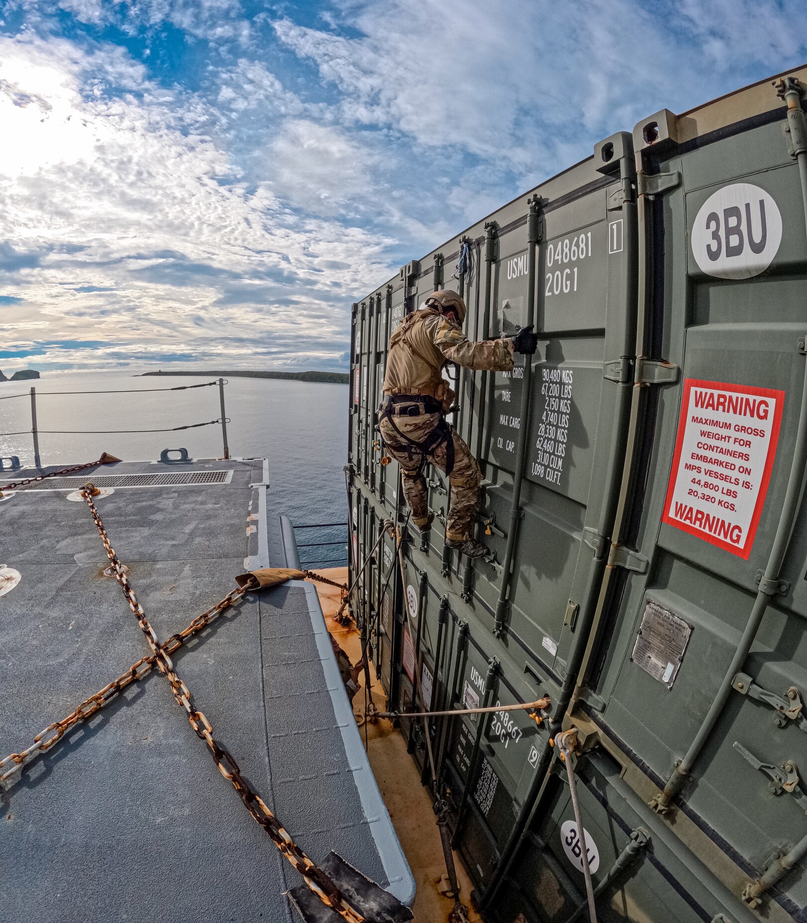 APRA HARBOR, Guam (Jan. 11, 2023) Sailors assigned to Explosive Ordnance Disposal Mobile Unit (EODMU) 5 conduct an at sea damage repair exercise involving a simulated explosive hazard aboard the Military Sealift Command 2nd Lt. John P. Bobo-class cargo ship USNS Sgt. William R. Button (T-AK 3012) as part of an EODMU platoon certification. EODMU 5 is assigned to Commander, Task Force 75, which executes command and control of assigned Navy Expeditionary Combat Forces in the U.S. 7th Fleet area of operations. They plan and execute Naval Construction, Expeditionary Logistics, Explosive Ordnance Disposal, Maritime Expeditionary Security, and Exploitation Forces assigned to Commander, U.S. 7th Fleet for crisis response, humanitarian assistance, and major combat operations. (U.S. Navy Photo by Chief Mass Communication Specialist Chad M. Butler)