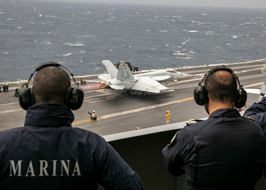 ADRIATIC SEA (Jan. 16, 2023) Cmdr. Angelo Bancale, left, commanding officer of the Italian Navy Carlo Bergamini-class frigate ITS Alpino (F 594), observes an F/A-18E Super Hornet, attached to Strike Fighter Squadron (VFA) 143, launch from the Nimitz-class aircraft carrier USS George H.W. Bush (CVN 77) during a visit to the ship, Jan. 16, 2023. Carrier Air Wing (CVW) 7 is the offensive air and strike component of Carrier Strike Group (CSG) 10 and the George H.W. Bush CSG. The squadrons of CVW-7 are VFA-143, VFA-103, VFA-86, VFA-136, Carrier Airborne Early Warning Squadron (VAW) 121, Electronic Attack Squadron (VAQ) 140, Helicopter Sea Combat Squadron (HSC) 5, and Helicopter Maritime Strike Squadron (HSM) 46. The George H.W. Bush CSG is on a scheduled deployment in the U.S. Naval Forces Europe area of operations, employed by U.S. Sixth Fleet to defend U.S., allied and partner interests. The George H.W. Bush Carrier Strike Group is on a scheduled deployment in the U.S. Naval Forces Europe area of operations, employed by U.S. Sixth Fleet to defend U.S., allied and partner interests. (U.S. Navy photo by Mass Communication Specialist 3rd Class Nicholas Avis)