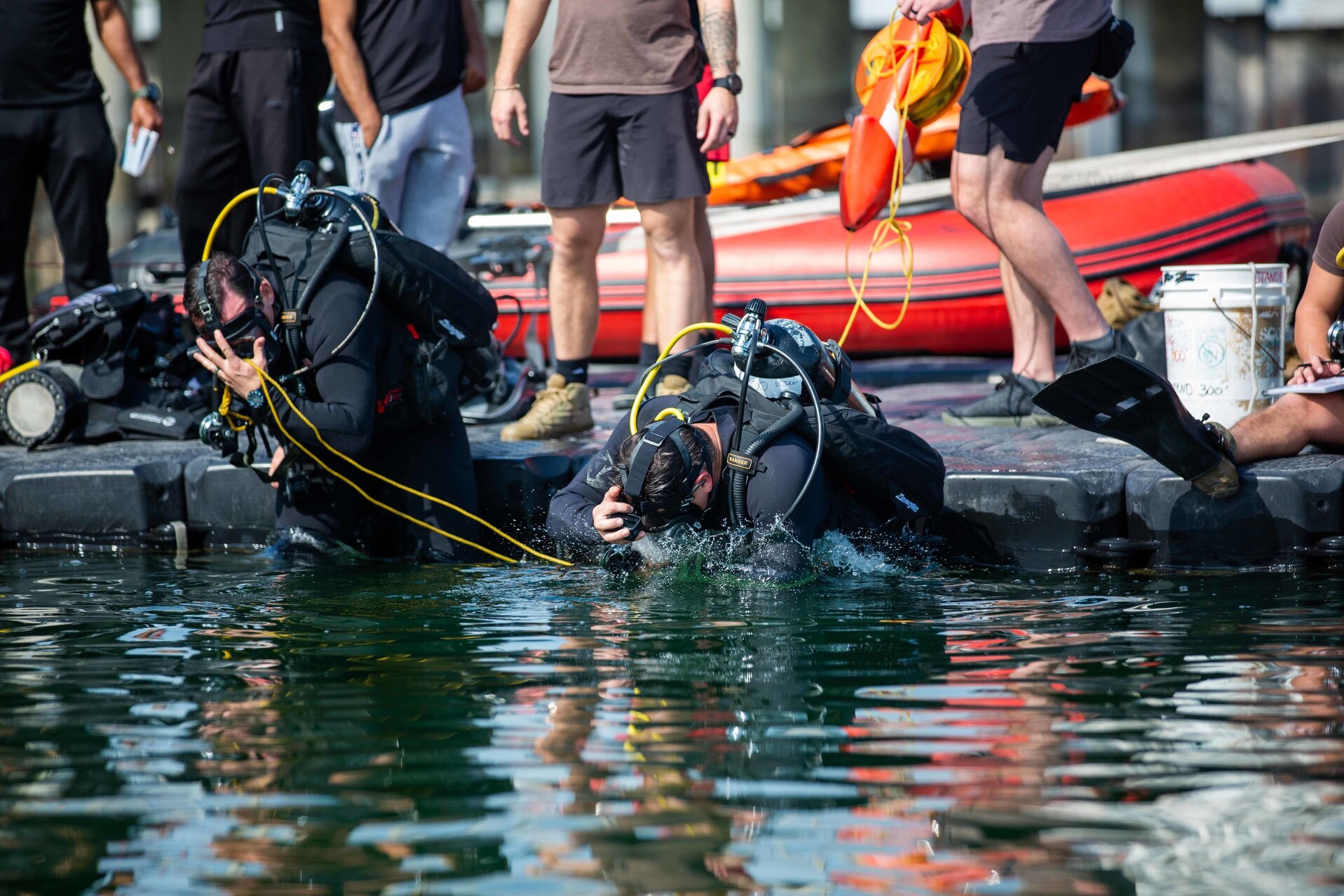 MANAMA, Bahrain (Jan. 17, 2023) U.S. Navy divers assigned to Task Force 56 and members of the Royal Bahrain Naval Force conduct a pre-dive brief during exercise Neon Defender 23, Jan. 17, in Manama, Bahrain. Neon Defender is an annual bilateral training event between U.S. Naval Forces Central Command and Bahrain that focuses on maritime security operations, and installation defense medical response. (U.S. Army photo by Sergeant Brandon Murphy)