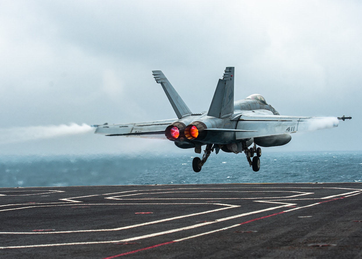 SOUTH CHINA SEA (Jan. 19, 2023) An F/A-18E Super Hornet from the “Blue Diamonds” of Strike Fighter Squadron (VFA) 146 launches from the flight deck of the aircraft carrier USS Nimitz (CVN 68), Jan 19, 2023. Nimitz is in U.S. 7th Fleet conducting routine operations. 7th Fleet is the U.S. Navy's largest forward-deployed numbered fleet, and routinely interacts and operates with Allies and partners in preserving a free and open Indo-Pacific region. (U.S. Navy photo by Mass Communication Specialist 3rd Class Joseph Calabrese)