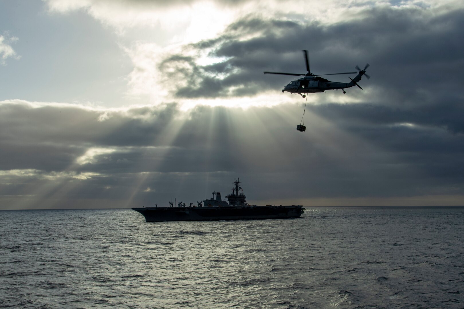 PACIFIC OCEAN (Jan. 20, 2023) An MH-60S Sea Hawk helicopter assigned to Helicopter Sea Combat Squadron (HSC) 14 participates in an ammunition transfer with the Nimitz-class aircraft carriers USS Carl Vinson (CVN 70), front, and USS Abraham Lincoln (CVN 72), not pictured, during a replenishment-at-sea with the fleet replenishment oiler USNS Henry J. Kaiser (T-AO 187) in the Pacific Ocean. (U.S. Navy photo by Mass Communication Specialist 2nd Class Madison Cassidy)