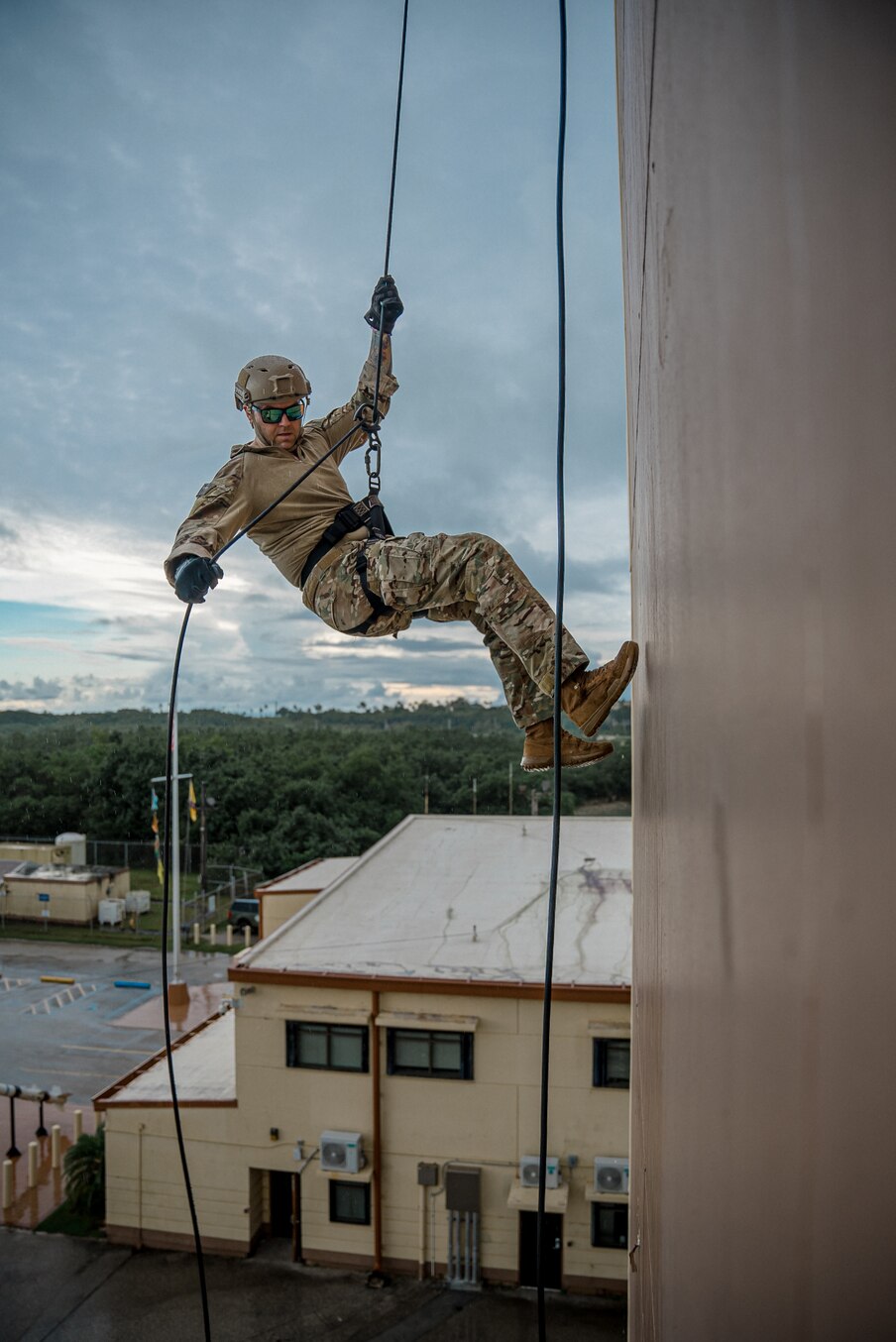 SANTA RITA, Guam (Jan. 12, 2023) Sailors assigned to Explosive Ordnance Disposal Mobile Unit (EODMU) 5 rappel and fast rope from the EODMU-5 command tower during a training exercise as part of an EODMU platoon certification onboard Naval Base Guam, Jan. 12, 2023. EODMU-5 is assigned to Commander, Task Force 75, which executes command and control of assigned Navy Expeditionary Combat Forces in the 7th Fleet area of operations. They plan and execute Naval Construction, Expeditionary Logistics, Explosive Ordnance Disposal, Maritime Expeditionary Security, and Exploitation Forces assigned to Commander, 7th Fleet for crisis response, humanitarian assistance, and major combat operations. (U.S. Navy Photo by Chief Mass Communication Specialist Chad M. Butler)