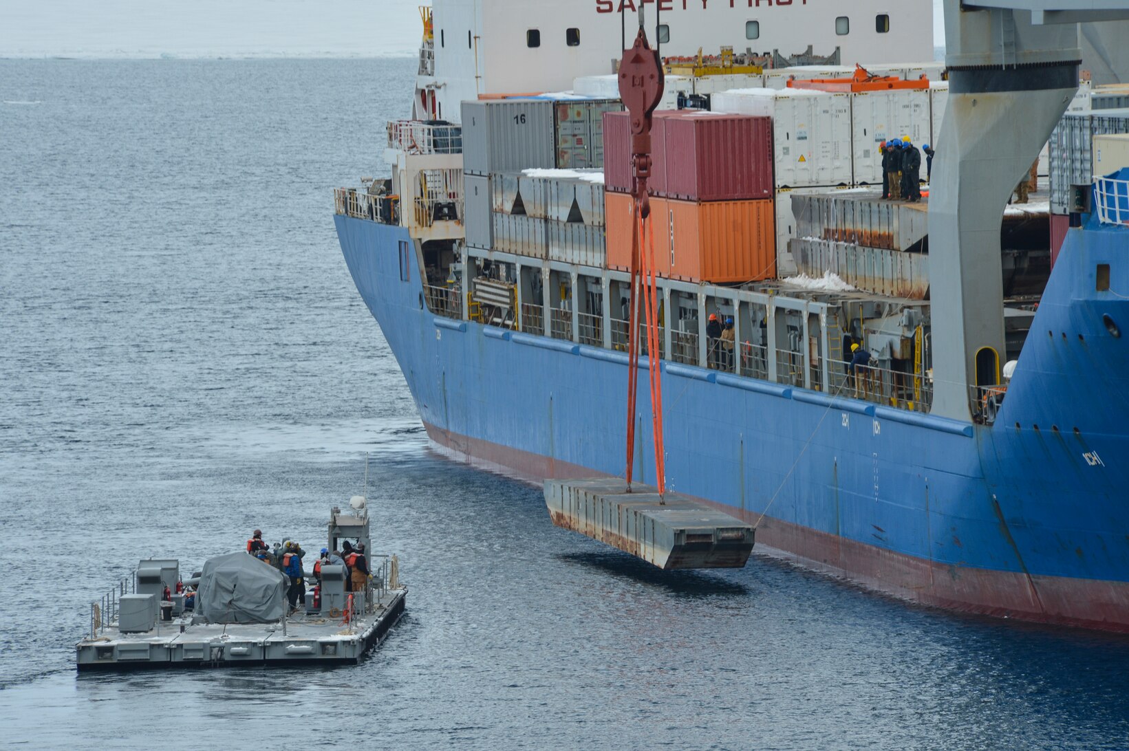 MCMURDO STATION, Antarctica (Jan. 26, 2023) Sailors from Navy Cargo Handling Battalion (NCHB) 1 and NCHB-5 offload sections of a modular causeway system from the Military Sealift Command-chartered cargo ship MV Ocean Giant to Soldiers from U.S. Army 7th Transportation Brigade (Expeditionary) at McMurdo Station, Antarctica. Joint Task Force-Support Forces Antarctica (JTF-SFA), oversees the activities of the joint services and provides Department of Defense support to the National Science Foundation (NSF) and United States Antarctic Program (USAP) through Operation Deep Freeze. (U.S. Navy photo by Senior Chief Mass Communication Specialist RJ Stratchko)