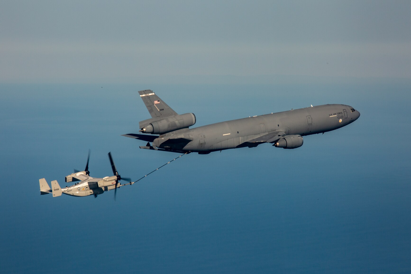 PACIFIC OCEAN (Jan. 25, 2023) A KC-10 Extender from the 9th Air Refueling Squadron and a CMV-22B Osprey from Fleet Logistics Multi-Mission Squadron (VRM) 30 perform a mid-flight refueling. VRM-30, assigned to Carrier Air Wing 9 is currently based out of Naval Air Station North Island in support of routine operations in U.S. 3rd Fleet. (U.S. Navy photo by Mass Communication Specialist 2nd Class Lake Fultz)