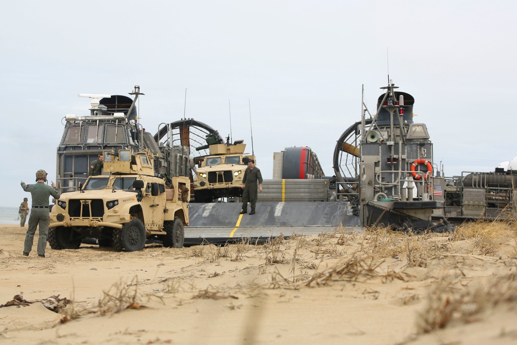 FORT STORY, Va. (Jan. 30, 2023) U.S. Marines with 2nd Marine Division coordinate with U.S. Sailors with U.S. Second Fleet to unload Joint Light Tactical Vehicles for Amphibious Exercise 2023 at Joint Expeditionary Base Little Creek-Fort Story, Virginia, Jan. 30, 2023. AMPHEX is a joint exercise that demonstrates littoral interoperability and increased proficiency in operational maneuvers, including: familiarization with U.S. Navy landing craft air cushion and landing craft utilities, amphibious beach landings, air-assault drills and combined live-fire training. (U.S. Marine Corps photo by Sgt. Kealii De Los Santos)