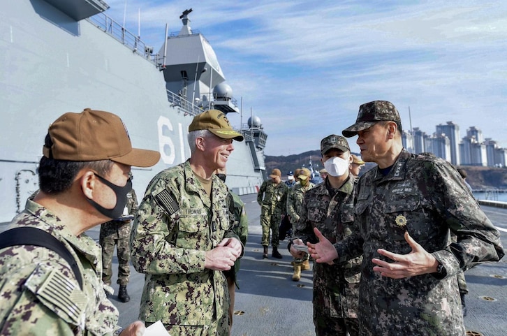 BUSAN, Republic of Korea (Feb. 2, 2023) Vice Admiral Kim Jung-soo, Commander Republic of Korea Fleet leads Vice Adm. Karl Thomas, Commander, US 7th Fleet and Staff on a tour of the flight deck aboard the Republic of Korea Navy Dokdo-class Amphibious Assault Ship ROKS Marado (LPH-6112) in Busan, ROK. Vice Adm. Thomas is in the Republic of Korea to attend the 7th annual Anti-submarine Warfare Cooperation Committee meeting. (Courtesy photo by Commander, ROK Fleet Public Affairs)