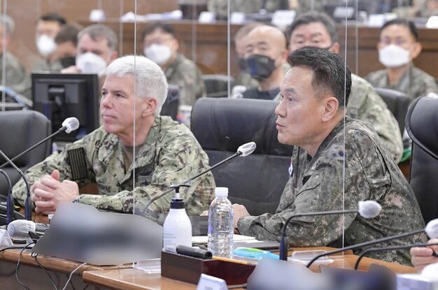 Republic of Korea (Feb. 2, 2023) Vice Adm. Karl Thomas, Commander, US 7th Fleet (left) and Vice Admiral Kim Jung-soo, Commander Republic of Korea Fleet (right) receive a combined brief on naval operations in and around the Korean peninsula. Vice Adm. Thomas is in the Republic of Korea to attend the 7th annual Anti-submarine Warfare Cooperation Committee meeting. (Courtesy photo by Commander, ROK Fleet Public Affairs)