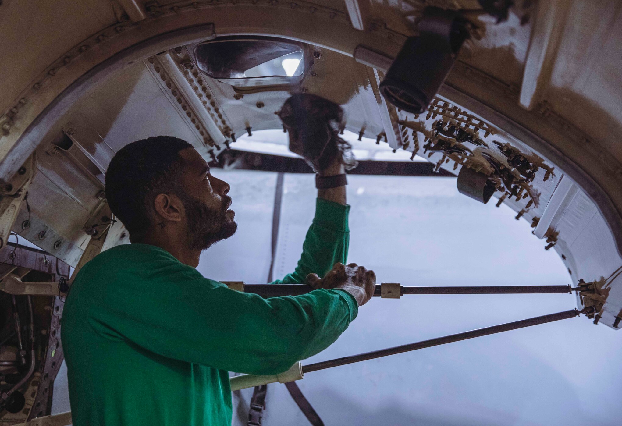 MEDITERRANEAN SEA (Jan. 30, 2023) Aviation Machinist’s Mate 3rd Class Michael Yambo, assigned to Strike Fighter Squadron (VFA) 86, wipes down the undercarriage of an F/A-18E Super Hornet aircraft aboard the Nimitz-class aircraft carrier USS George H. W. Bush (CVN 77), Jan. 30, 2023. Carrier Air Wing (CVW) 7 is the offensive air and strike component of Carrier Strike Group (CSG) 10 and George H.W. Bush CSG. The squadrons of CVW-7 are VFA-143, VFA-103, VFA-86, VFA-136, VAW-121, Helicopter Sea Combat Squadron (HSC) 5, and Helicopter Maritime Strike Squadron (HSM) 46. The George H.W. Bush CSG is on a scheduled deployment in the U.S. Naval Forces Europe area of operations, employed by U.S. Sixth Fleet to defend U.S., allied and partner interests. (U.S. Navy photo by Mass Communication Specialist 3rd Class Chandler Ludke)