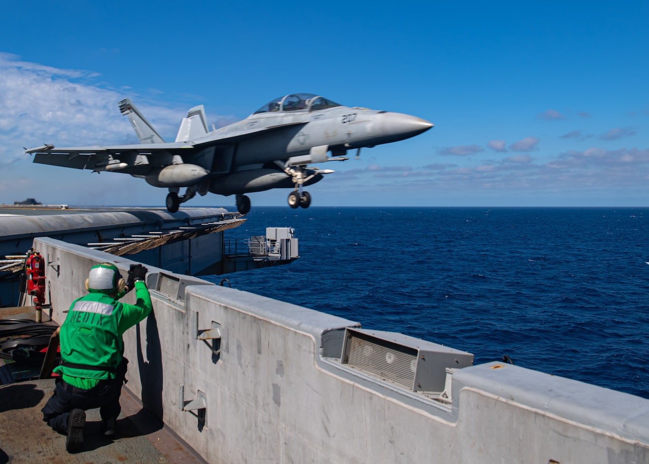 SOUTH CHINA SEA (Feb. 2, 2023) An F/A-18F Super Hornet from the “Mighty Shrikes” of Strike Fighter Squadron (VFA) 94 launches from the flight deck of the aircraft carrier USS Nimitz (CVN 68). Nimitz is in U.S. 7th Fleet conducting routine operations. 7th Fleet is the U.S. Navy's largest forward-deployed numbered fleet, and routinely interacts and operates with Allies and partners in preserving a free and open Indo-Pacific region. (U.S. Navy photo by Mass Communication Specialist 3rd Class Joseph Calabrese)