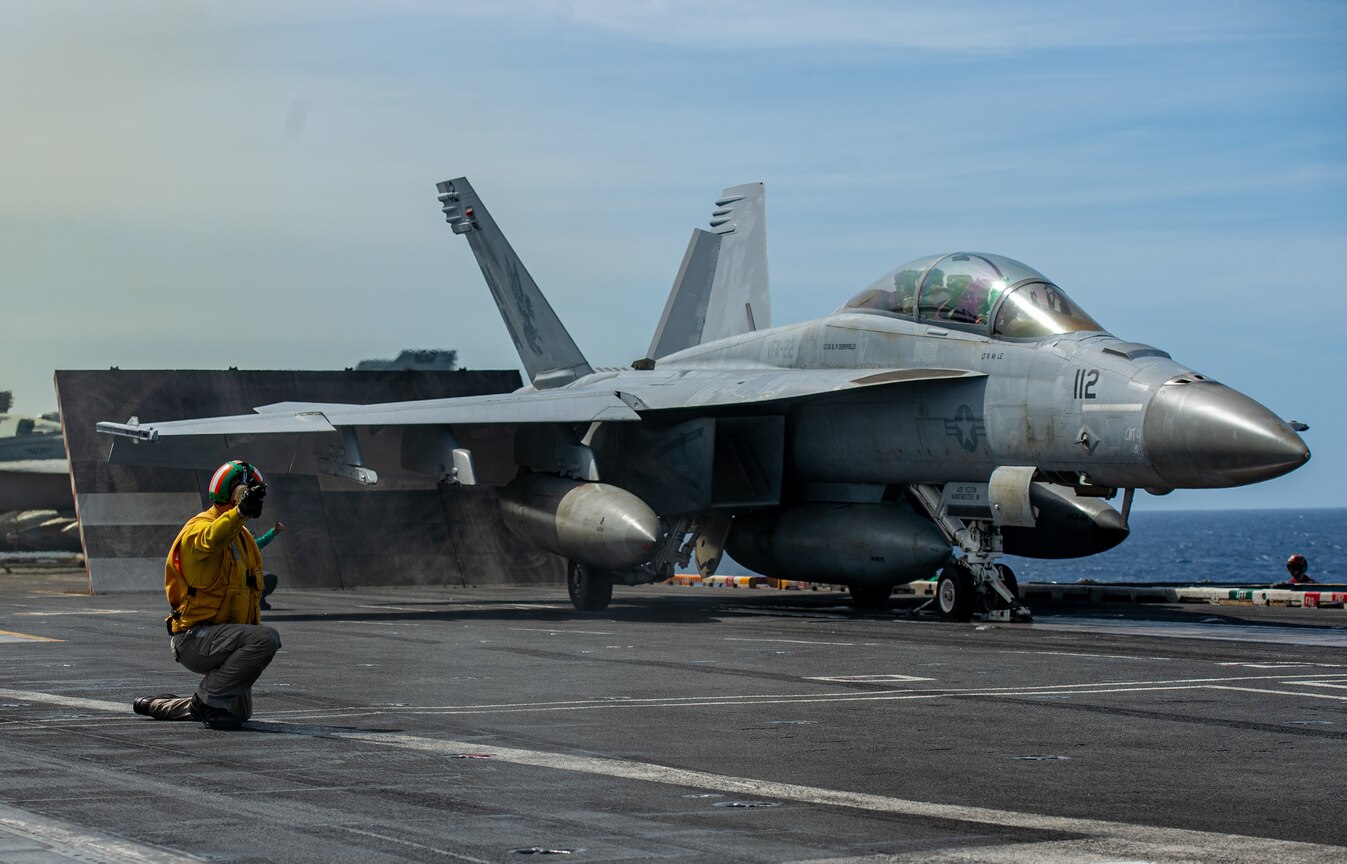 SOUTH CHINA SEA (Feb. 3, 2023) An F/A-18F Super Hornet from the "Fighting Redcocks" of Strike Fighter Squadron (VFA) 22 launches from the aircraft carrier USS Nimitz (CVN 68). Nimitz is in U.S. 7th Fleet conducting routine operations. 7th Fleet is the U.S. Navy's largest forward-deployed numbered fleet, and routinely interacts and operates with Allies and partners in preserving a free and open Indo-Pacific region. (U.S. Navy photo by Mass Communication Specialist 2nd Class Justin McTaggart)