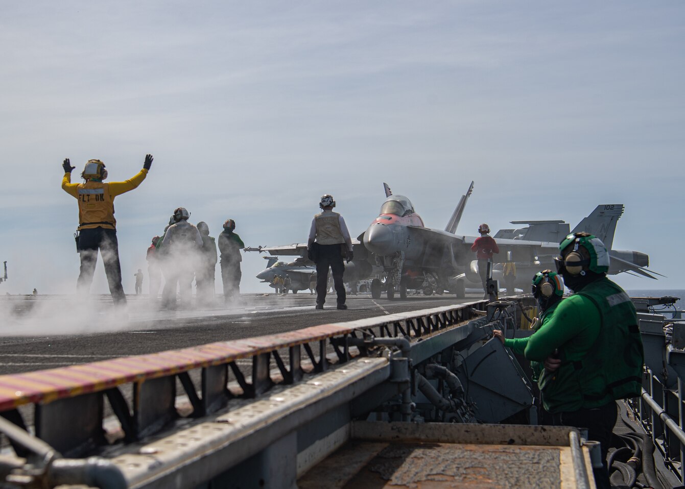 SOUTH CHINA SEA (Feb. 3, 2023) A Sailor directs an F/A-18F Super Hornet from the "Mighty Shrikes" of Strike Fighter Squadron (VFA) 94 on the flight deck of the aircraft carrier USS Nimitz (CVN 68). Nimitz is in U.S. 7th Fleet conducting routine operations. 7th Fleet is the U.S. Navy's largest forward-deployed numbered fleet, and routinely interacts and operates with Allies and partners in preserving a free and open Indo-Pacific region. (U.S. Navy photo by Mass Communication Specialist 3rd Class Joseph Calabrese)