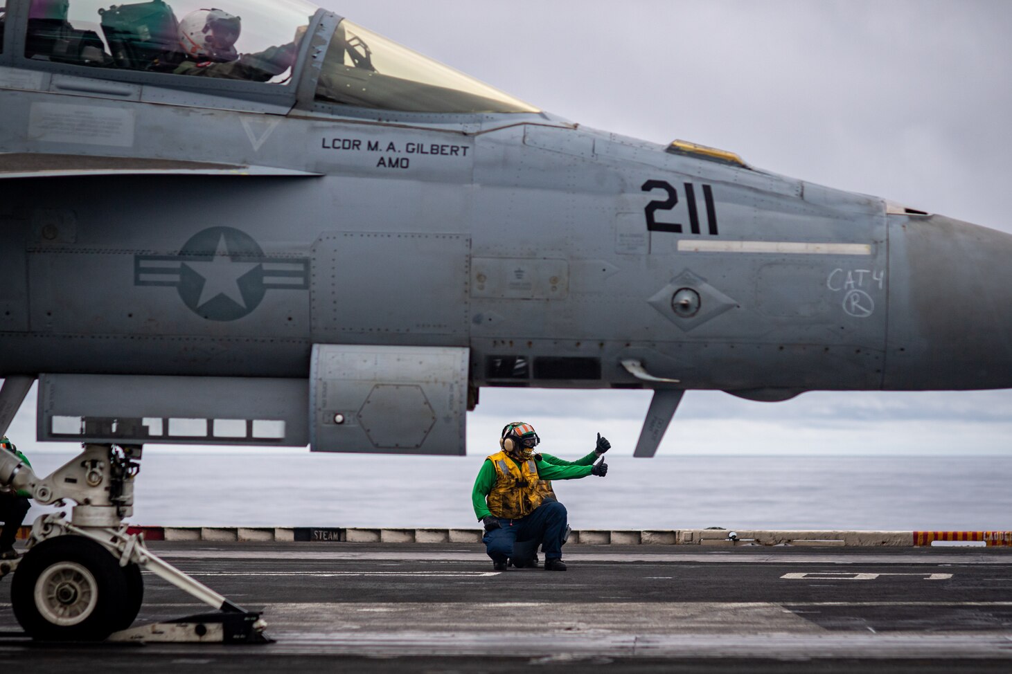 SOUTH CHINA SEA (Feb. 13, 2023) Sailors launch an F/A-18F Super Hornet from the “Mighty Shrikes” of Strike Fighter Squadron (VFA) 94 from the flight deck of the aircraft carrier USS Nimitz (CVN 68). Nimitz Carrier Strike Group (NIMCSG) and Makin Island Amphibious Ready Group (MKI ARG), with embarked 13th Marine Expeditionary Unit (13th MEU), are conducting combined expeditionary strike force (ESF) operations, demonstrating unique high-end war fighting capability, maritime superiority, power projection and readiness. Operations include integrated training designed to advance interoperability between the two groups while simultaneously demonstrating the U.S. commitment to our alliances and partnerships in the Indo-Pacific region. Nimitz is in U.S. 7th Fleet conducting routine operations. U.S. 7th Fleet is the U.S. Navy's largest forward-deployed numbered fleet, and routinely interacts and operates with Allies and partners in preserving a free and open Indo-Pacific region. (U.S. Navy photo by Mass Communication Specialist 3rd Class Hannah Kantner)