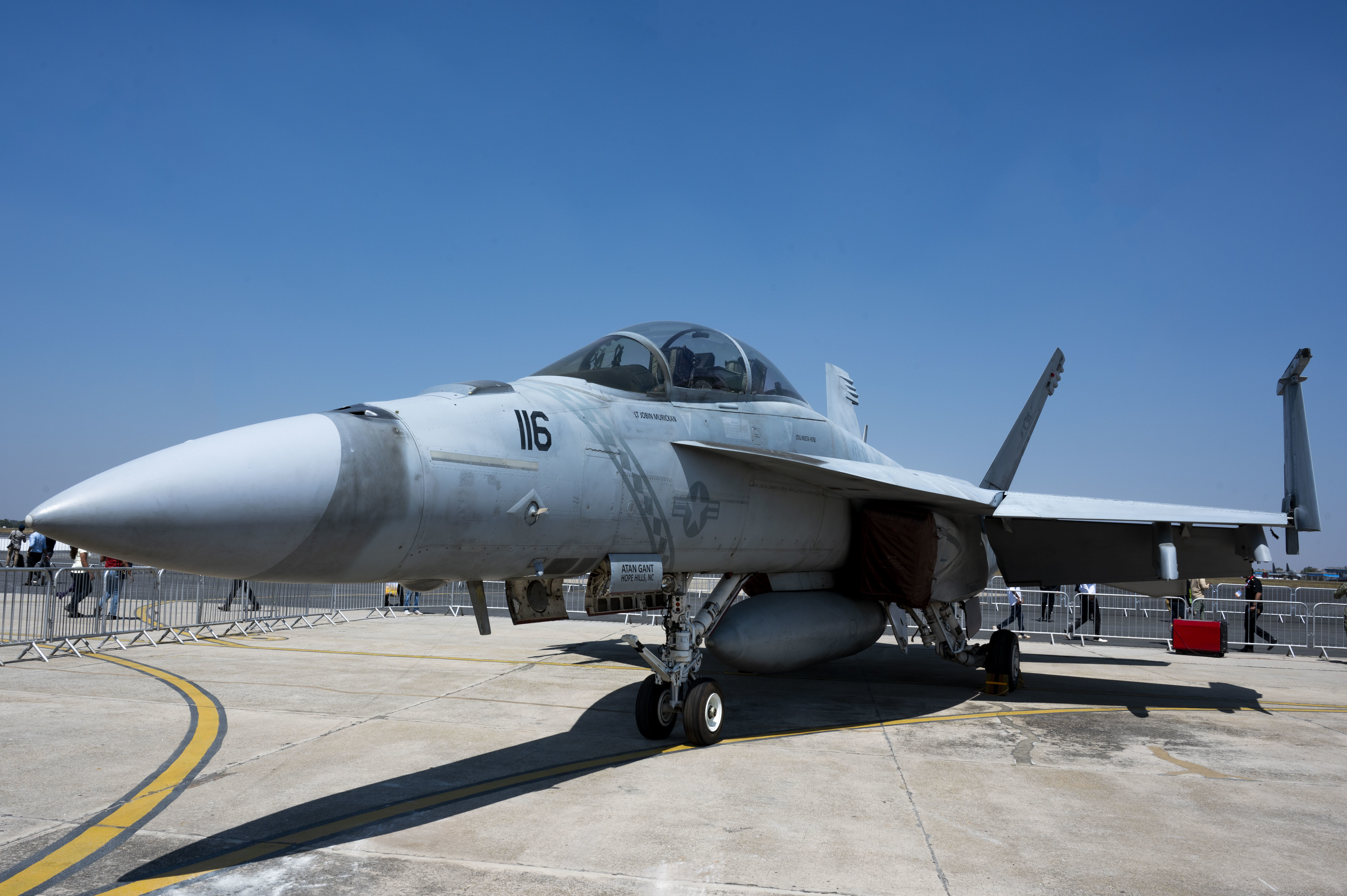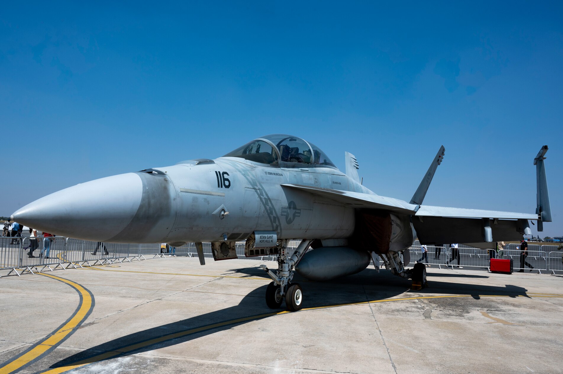 A U.S. Navy F/A-18 Super Hornet sits on display at Aero India 23 at Yelahanka Air Station, Bengaluru, India on Feb. 13, 2023. The U.S. military is participating in Aero India by providing aerial demonstrations and static aircraft to strengthen its partnership with India while furthering military-to-military relationships. (U.S. Air Force Photo by Airman 1st Class Emily Saxton)