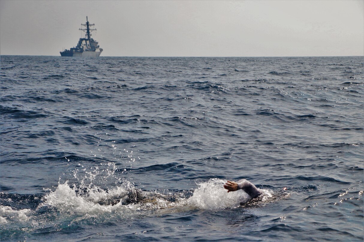GULF OF OMAN (Feb. 15, 2023) Damage Controlman 2nd Class Arron Quade, assigned to the guided-missile destroyer USS Paul Hamilton (DDG 60), swims during a search and rescue exercise in the Gulf of Oman, Feb. 15, 2023. Paul Hamilton is deployed to the U.S. 5th Fleet area of operations to help ensure maritime security and stability in the Middle East region. (U.S. Navy photo by Ensign Connor Doherty)