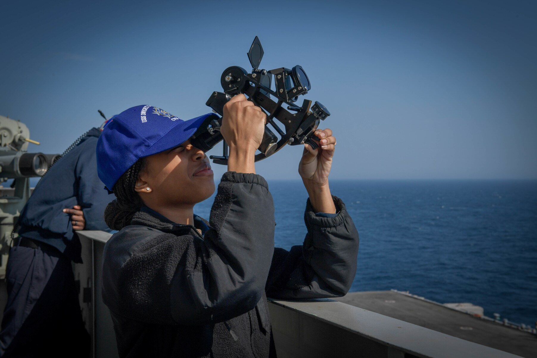 ATLANTIC OCEAN (Feb. 23, 2023) Quartermaster Seaman Leteiacesia Lewis, from Kinston, N.C., shoots sun lights with a sextant aboard the Nimitz-class aircraft carrier USS Dwight D. Eisenhower (CVN 69). IKE, with embarked Carrier Air Wing 3, is underway conducting the Tailored Ship's Training Availability (TSTA) and Final Evaluation Problem (FEP) as part of the basic phase of the Optimized Fleet Response Plan. (U.S. Navy photo by Mass Communication Specialist 3rd Class Rodrigo Caldas)