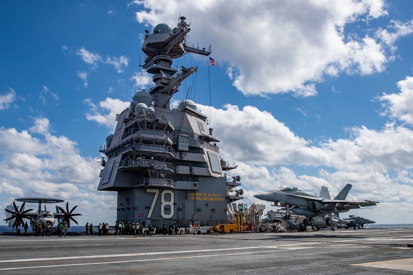 ATLANTIC OCEAN (March 14, 2023) An F/A-18F Super Hornet attached to the "Blacklions" of Strike Fighter Squadron (VFA) 213, prepares to land on the flight deck of the first-in-class aircraft carrier USS Gerald R. Ford (CVN 78), March 14, 2023. Gerald R. Ford is underway in the Atlantic Ocean executing its Composite Training Unit Exercise (COMPTUEX), an intense, multi-week exercise designed to fully integrate a carrier strike group as a cohesive, multi-mission fighting force and to test their ability to carry out sustained combat operations from the sea. As the first-in-class ship of Ford-class aircraft carriers, CVN 78 represents a generational leap in the U.S. Navy"s capacity to project power on a global scale. (U.S. Navy photo by Mass Communication Specialist 2nd Class Jennifer A. Newsome)