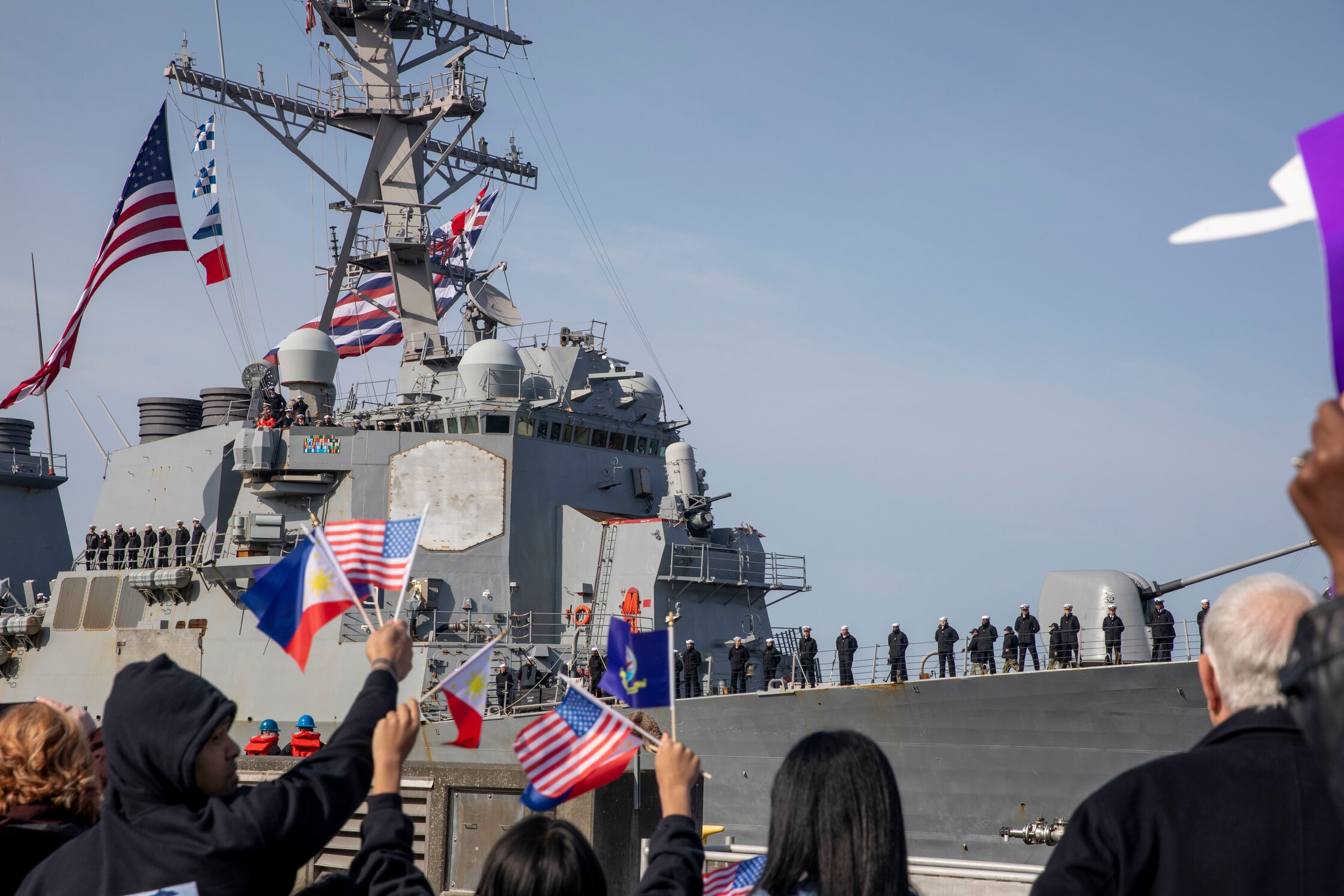 EVERETT, Wash. (March 17, 2023) Families and friends wave flags to Sailors aboard the Arleigh Burke-class guided-missile destroyer USS Barry (DDG 52) as the ship pulls into its new homeport at Naval Station Everett, Wash., March 17, 2023. The ship was previously forward-deployed to Yokosuka, Japan, for nearly seven years. (U.S. Navy photo by Mass Communication Specialist 2nd Class Ethan Soto)