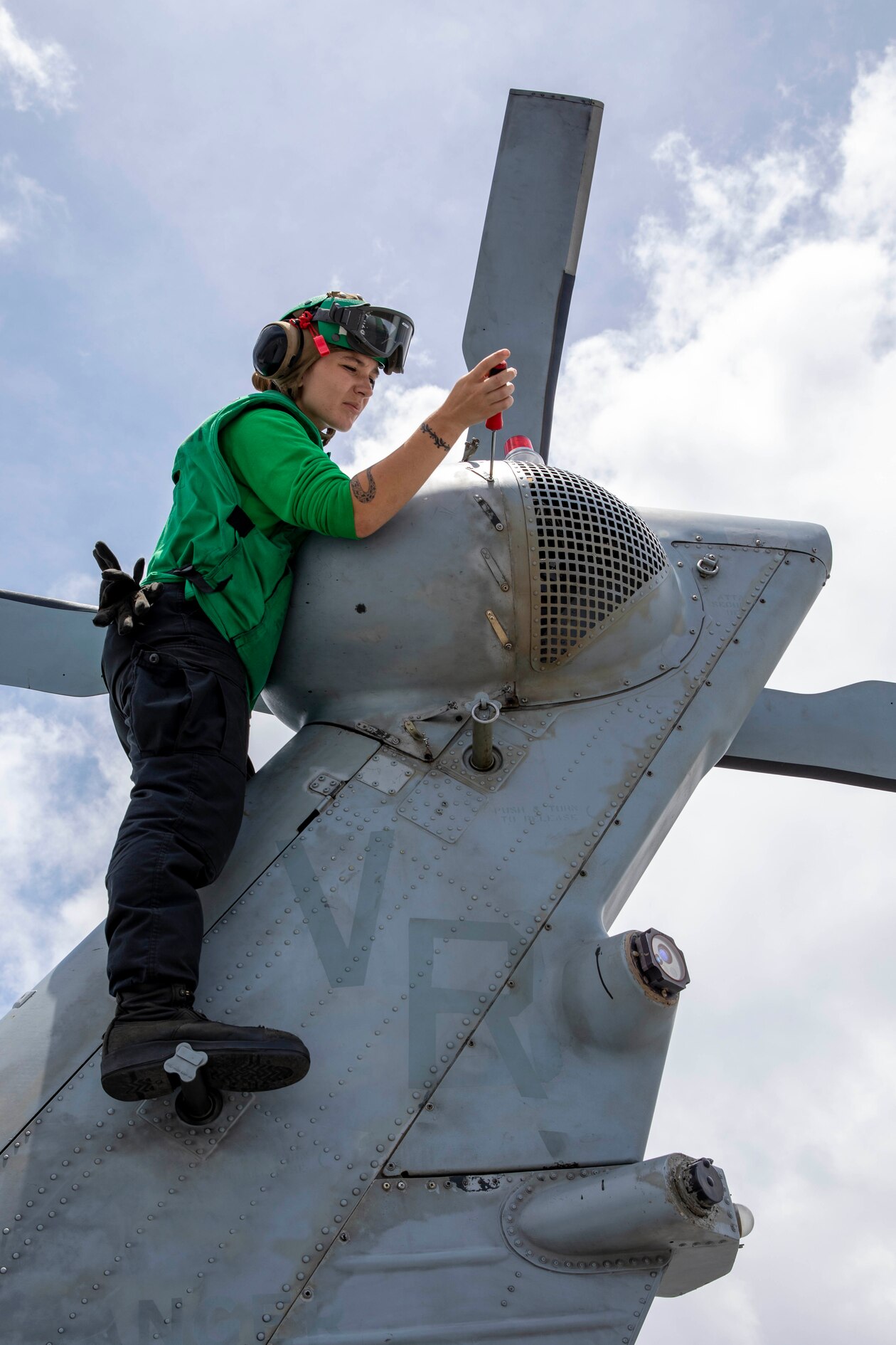 SOUTH CHINA SEA (March 29, 2023) Aviation Structural Mechanic 3rd Class Allie Burns, from Clarkston, Wash., removes gear box cowling from an MH-60S Sea Hawk helicopter assigned to the "Blackjacks" of Helicopter Sea Combat Squadron (HSC) 21 on the flight deck aboard Independence-variant littoral combat ship USS Charleston (LCS 18) in the South China Sea, March 29, 2023. Charleston, part of Destroyer Squadron 7, is on a rotational deployment, operating in the U.S. 7th Fleet area of operations to enhance interoperability with allies and partners and serve as a ready-response force in support of a free and open Indo-Pacific region. (U.S. Navy photo by Mass Communication Specialist 2nd Class Daniel Serianni)