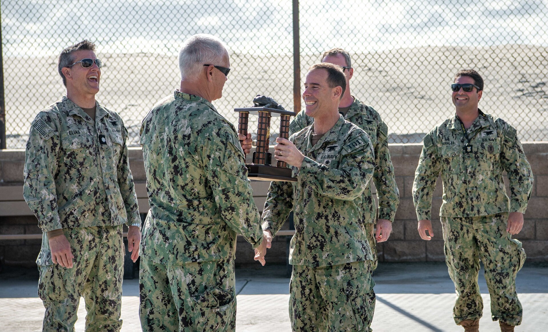 Rear Adm. Keith B. Davids, commander, Naval Special Warfare Command, presents a representative trophy during the Bull Frog turnover at Naval Amphibious Base Coronado. “The Bull Frog” title is given to the longest continuously serving active-duty U.S. Navy SEAL. NSW is the nation’s elite maritime special operations force that gains and maintains access and placement for the Fleet and Joint Force. (U.S. Navy photo by Mass Communication Specialist 2nd Class Alex Perlman/Released)