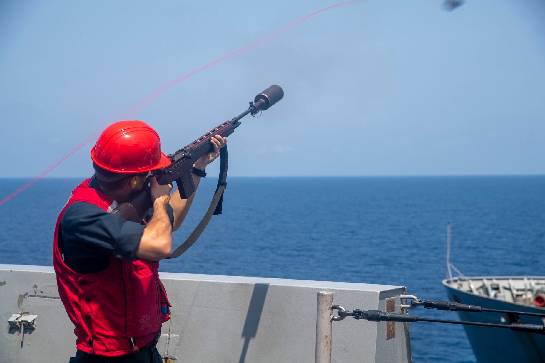 PACIFIC OCEAN (April 17. 2023) Gunner's Mate Seaman Dylan Yarnell fires a shot line to fleet dry cargo and ammunition ship USNS Charles Drew (T-AKE 10) from aboard the amphibious transport dock ship USS John P. Murtha (LPD 26), April 17, during a replenishment-at-sea. Murtha is designed to field an integrated amphibious force that can support operational commanders around the globe with both strike and amphibious capabilities. The Makin Island Amphibious Ready Group, comprised of amphibious assault ship USS Makin Island (LHD 8) and amphibious transport docks USS Anchorage (LPD 23) and John P. Murtha, is operating in the U.S. 7th Fleet area of operations with the embarked 13th MEU to enhance interoperability with Allies and partners and serve as a ready-response force to defend peace and maintain stability in the Indo-Pacific region. (U.S. Navy photo by Mass Communication Specialist 2nd Class Joshua Samoluk)