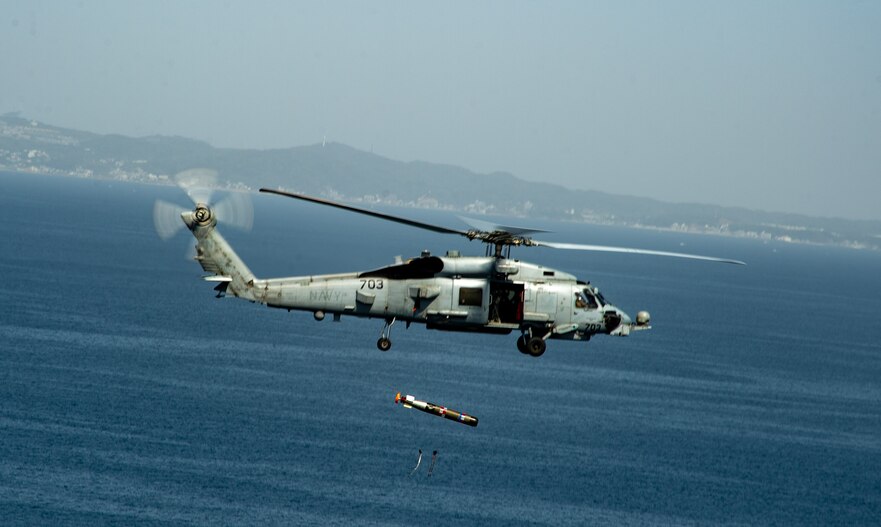 An MH-60R Seahawk attached to the “Saberhawks” of Helicopter Maritime Strike Squadron (HSM) 77 drops a torpedo during a torpedo exercise in Sagami Bay, Japan, April 13, 2023. The Saberhawks are forward-deployed to the 7th Fleet area of operation in support of a free and open Indo-pacific. (U.S. Navy photo by Mass Communication Specialist 2nd Class Askia Collins)