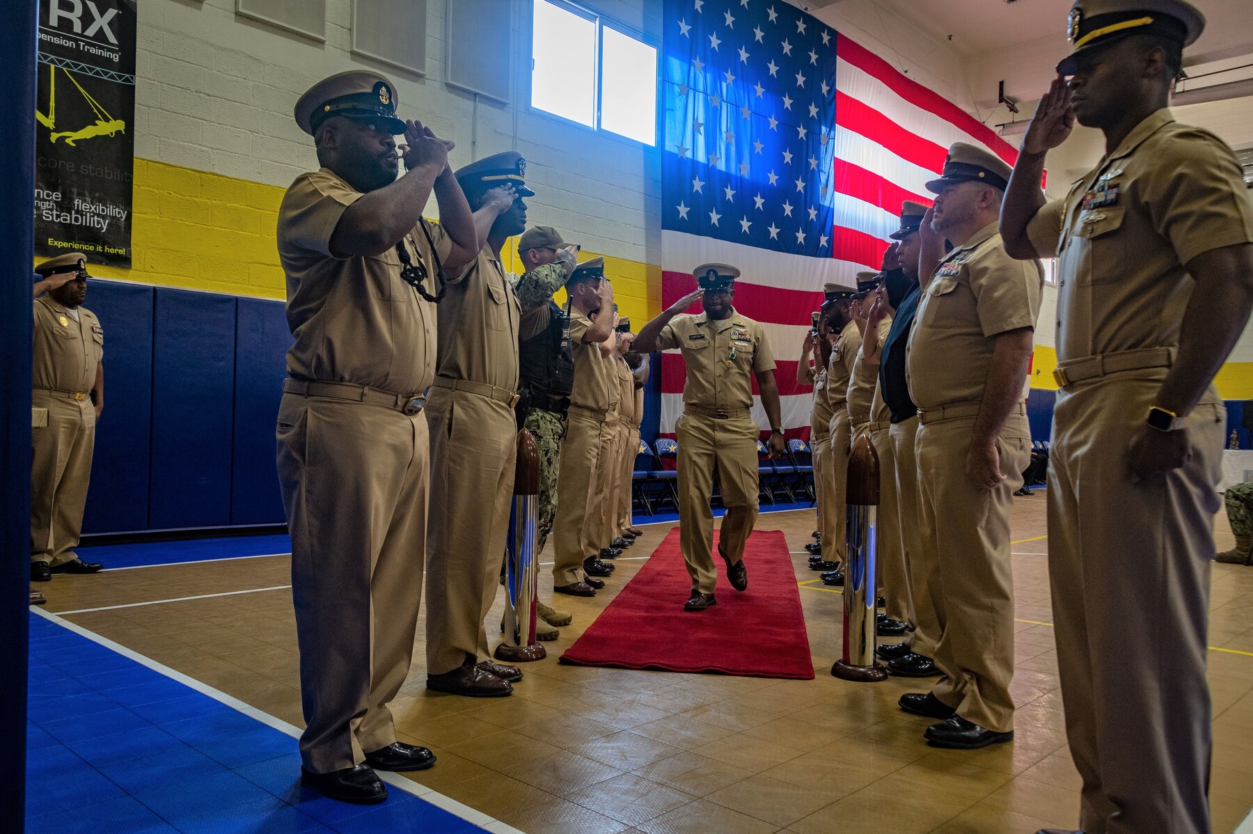 NAVAL SUPPORT ACTIVITY SOUDA BAY, Greece (April 28, 2023) Chief Aviation Boatswain’s Mate Dwayne Black, assigned to Naval Support Activity (NSA) Souda Bay, Greece, is piped ashore upon the conclusion of his Retirement Ceremony onboard NSA Souda Bay on April 28, 2023. NSA Souda Bay is an operational ashore installation which enables and supports U.S., Allied, Coalition, and Partner nation forces to preserve security and stability in the European, African, and Central Command areas of responsibility. (U.S. Navy photo by Mass Communication Specialist 2nd Class Delaney S. Jensen)