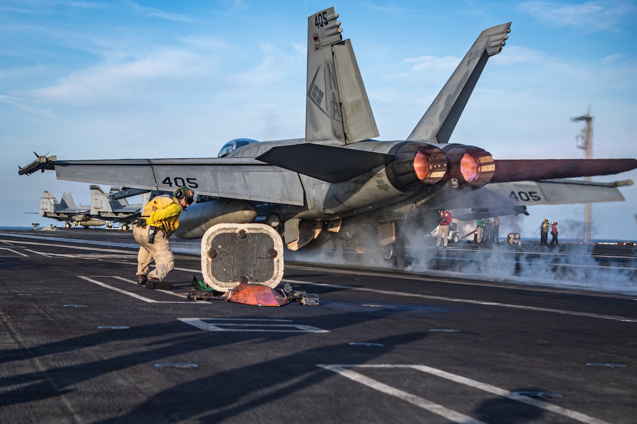 SOUTH CHINA SEA (May 1, 2023) An F/A-18E Super Hornet from the "Blue Diamonds" of Strike Fighter Squadron (VFA) 146 launches from the aircraft carrier USS Nimitz (CVN 68). Nimitz is in U.S. 7th Fleet conducting routine operations. 7th Fleet is the U.S. Navy's largest forward-deployed numbered fleet, and routinely interacts and operates with allies and partners in preserving a free and open Indo-Pacific region. (U.S. Navy photo by Mass Communication Specialist 3rd Class Hannah Kantner)