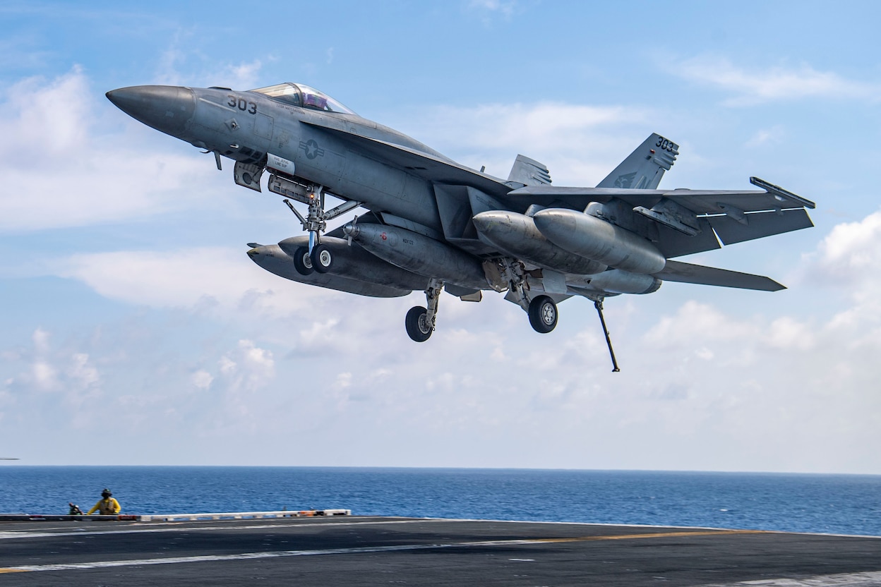 SOUTH CHINA SEA (May 2, 2023) An F/A-18E Super Hornet from the "Kestrels" of Strike Fighter Squadron (VFA) 137 makes an arrested landing on the flight deck of the aircraft carrier USS Nimitz (CVN 68). Nimitz is in U.S. 7th Fleet conducting routine operations. 7th Fleet is the U.S. Navy's largest forward-deployed numbered fleet, and routinely interacts and operates with allies and partners in preserving a free and open Indo-Pacific region. (U.S. Navy photo by Mass Communication Specialist 2nd Class Justin McTaggart)